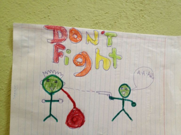 This is one of the reminders we have posted in our area of the classroom. Drawn by one of the students inclined to fight, it is an exaggerated depiction of the effects of not following the rules.
