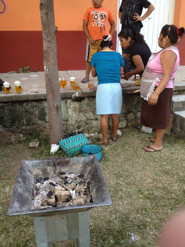 Just outside of the classrooms as were wrapping up teaching tonight, some women had brought a barbecue, a malt blender, and various other paraphernalia to assist in the making of candles in beer steins. They used the natural honey-gold color of one of the waxes with a thick white paraffin to form the foam which had to be installed quickly and outfitted with the wick.