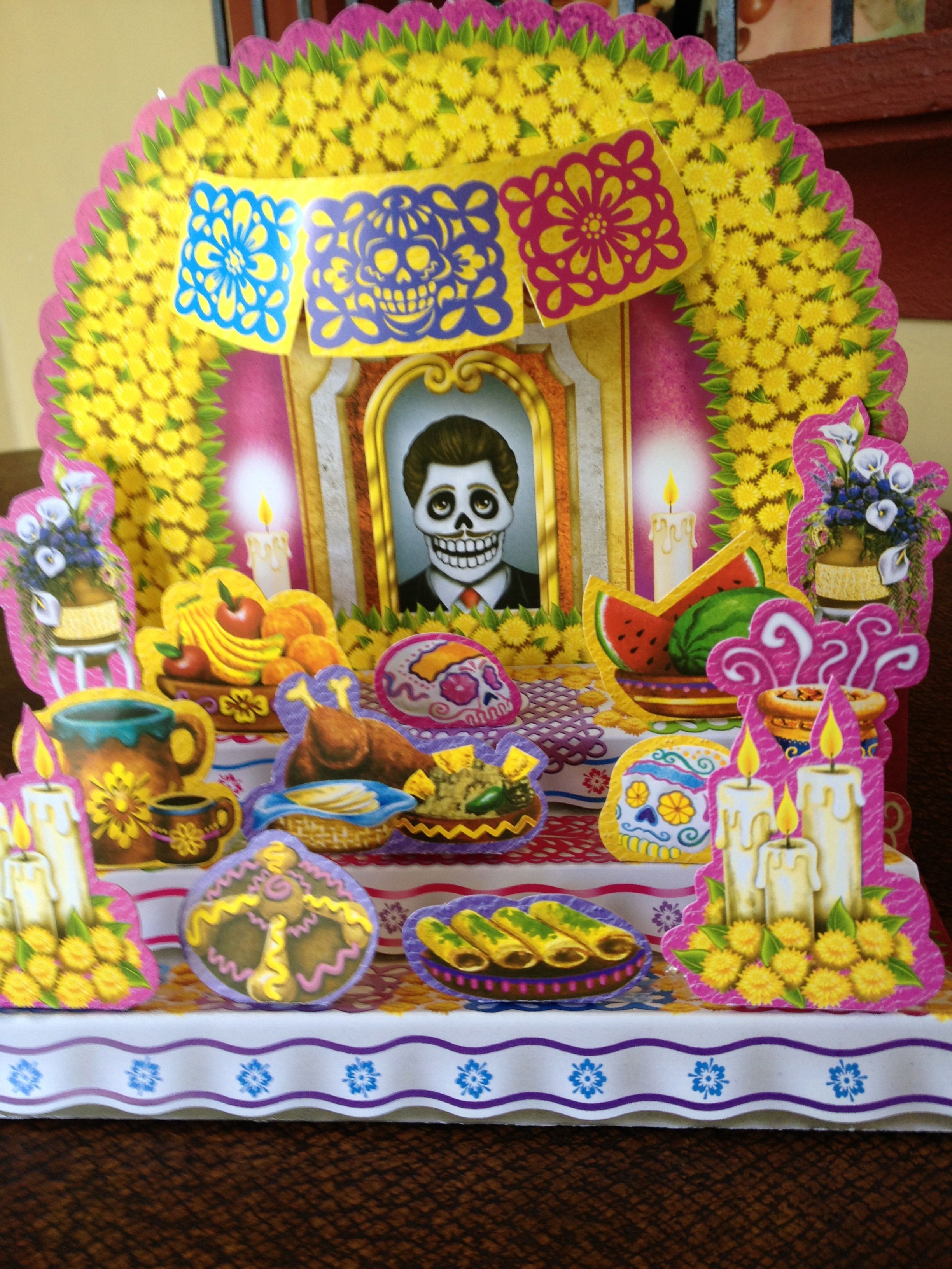 I bought a little didactic altar and asked my teacher if I could bring it into my Spanish class for us to assemble and discuss because some of the students aren’t taking any more classes and will miss out on the workshops we will have. It was a three-dimensional diorama that required some tape and some patience for me to construct it. I ended up constructing it alone, and we did not discuss it at all. Instead, we played a game that was a mix between Monopoly and Life – but much less interesting. Grounded on a space for more than half of the game (I had to miss turns until someone landed on my exact spot, and the rest were ahead of me as I was the last player), I normally would be frustrated, but I had this delightful little project to work on. And, I was learning more about the tradition and my own ability to have patience for creating something.