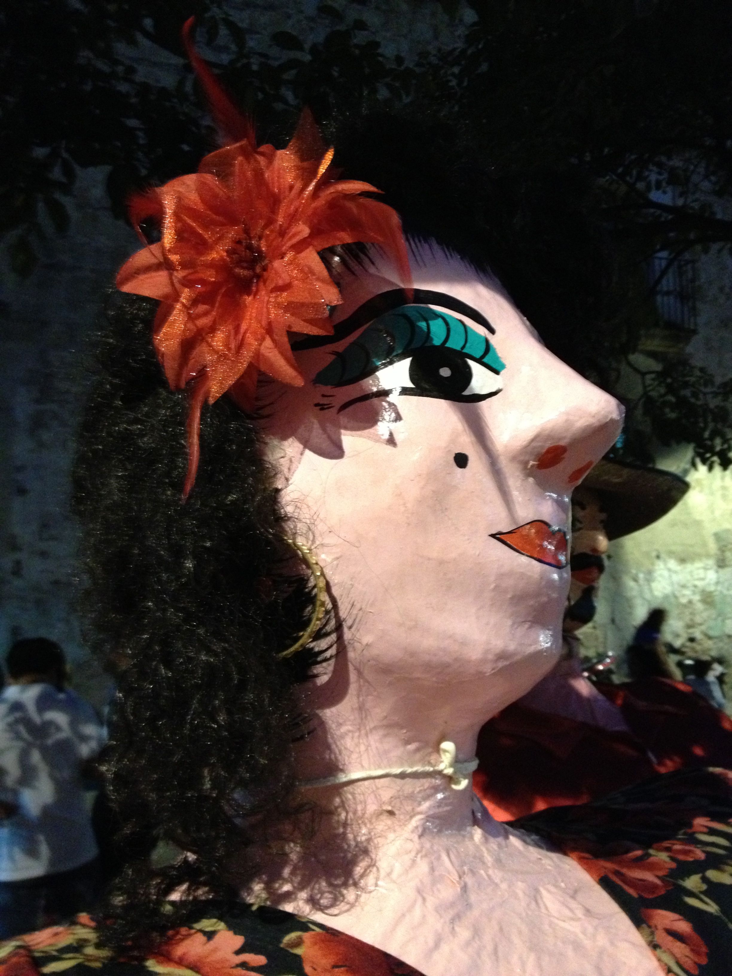 It is no wonder that the giant munecas in Oaxaca make me smile. Many of the ones that are out regularly have several different outfits. And, most spend much of their time dancing on the shoulders of the strong people whose faces sometimes appear from the folds of their satin blouses.