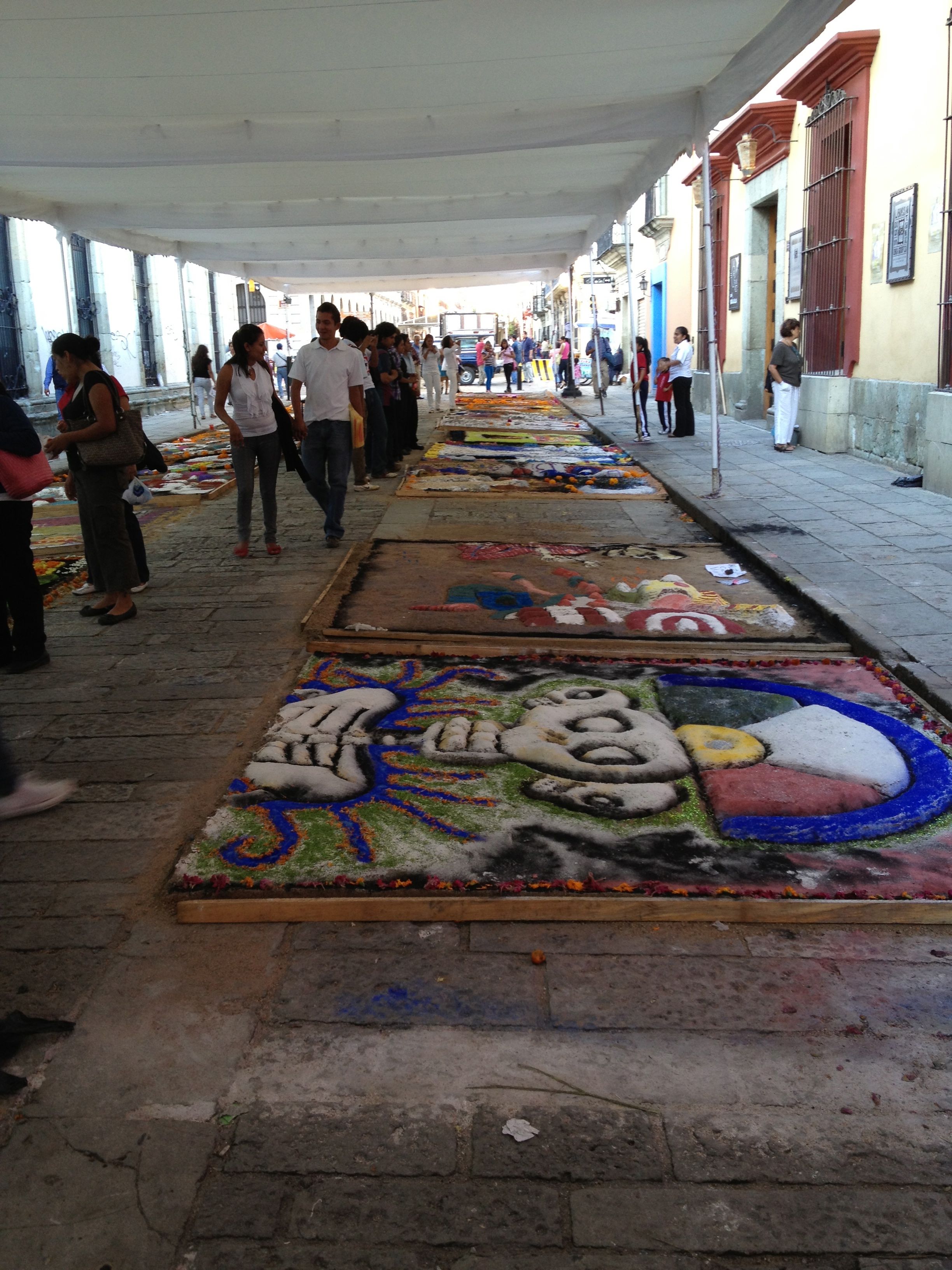 I head to the Zocalo nearly every night to see what there is to see, and there is always something to see. Last night, I was curious to see what the three structures with covers that were assembled the night before would be shielding from the elements. A market? A concert? These I have seen before on the Alcala. However, in addition to a couple of bands and some dancing, the structures protected the brilliant and multi-colored sand tapetes that must have been assembled overnight.