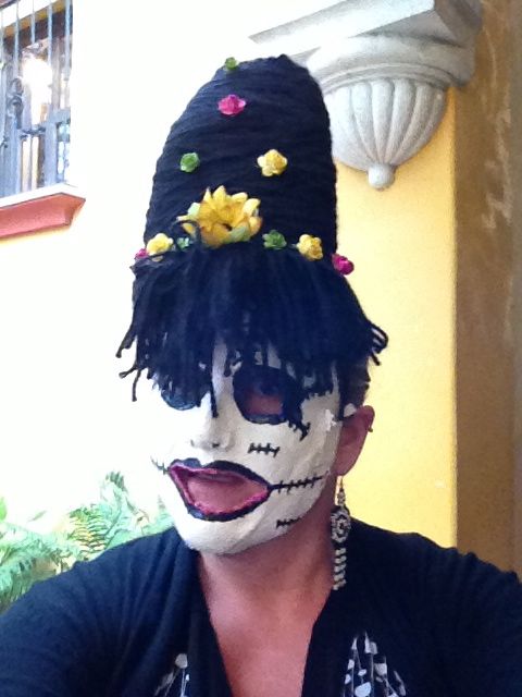 It really did feel like labor. After painting and putting acrylic on my mask, I then was informed that my mask was too “debil” (weak or feeble, but I prefer delicate). So, we had to add more layers of venda, use a blow dryer, live with the new “bandages” that could not be sanded at this point, repaint, reapply acrylic, but the face back under the blow dryer. I know my face said something about how I was done with the mask, and then I was really done. All I had left was to figure out an outfit to accompany her and conjure a name beyond Abeja. I call her Veronica, after one of the Ronettes, a group from Spanish Harlem that popularized the do.