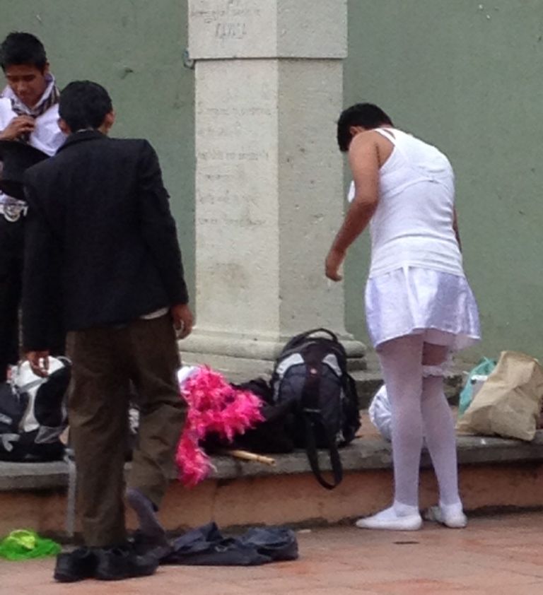 According to what I have read and seen the past few days, while you won’t see Mexican men cross-dressing on a regular basis, it is quite common for comparsas. There is a small plaza that is on my way to the Zocalo, and I have seen several groups readying themselves for the parades.
