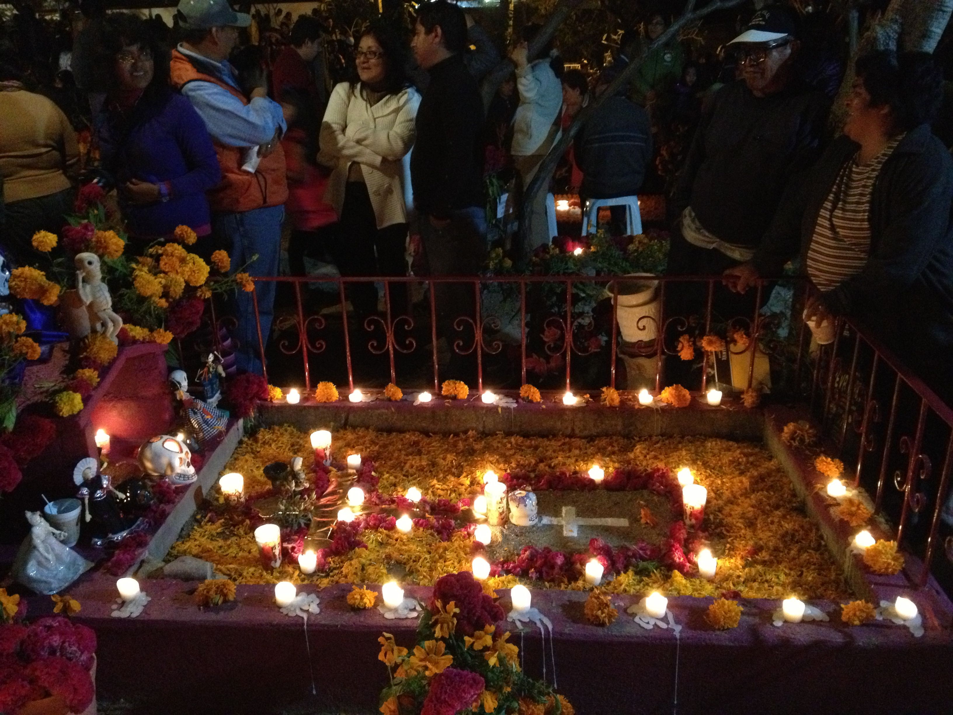 Friday night, we headed to San Felipe del Agua to another panteon. It was overflowing with people who had come to celebrate members of their families. Lighting candles, placing flowers, eating, telling stories, and welcoming tourists, people were present to say the names of the dead and to keep their memory alive and to take care of their resting place.