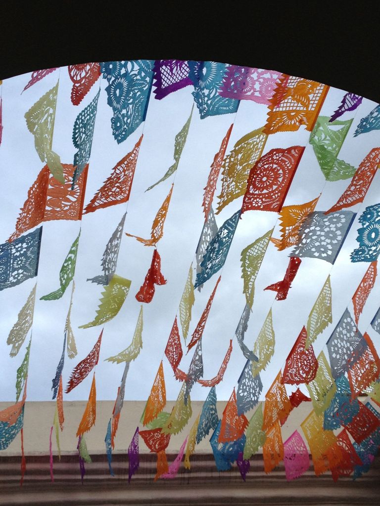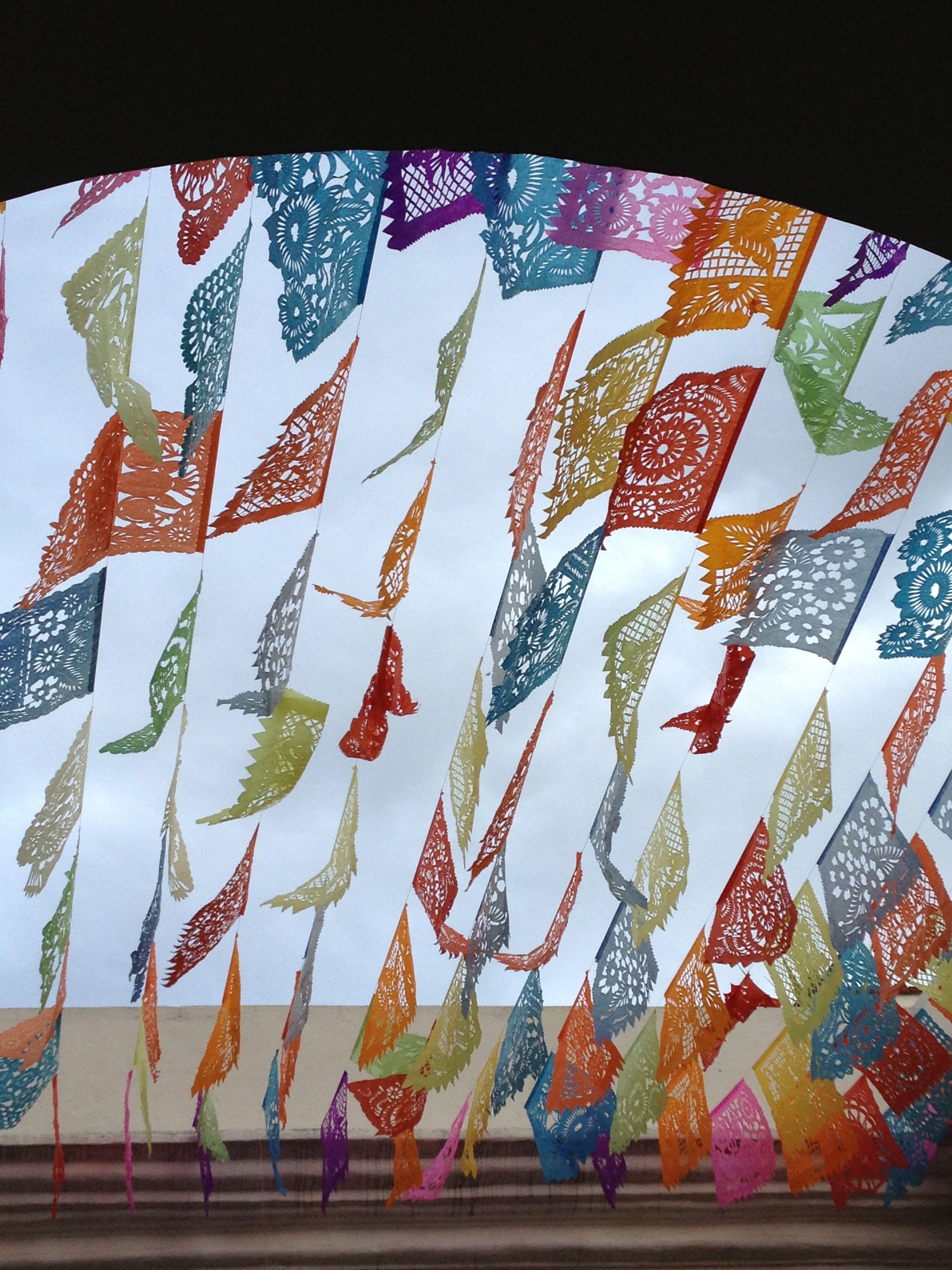 Papel picado (punched/perforated paper) is a Mexican folk art form that involves cutting a stack of colorful tissue paper with chisels, small scissors, or a small knife. The resulting intricately designed flags are connected with a string and are displayed during holidays and throughout the year in some locations. The patterns and hues vary depending on the holiday and the time of year.