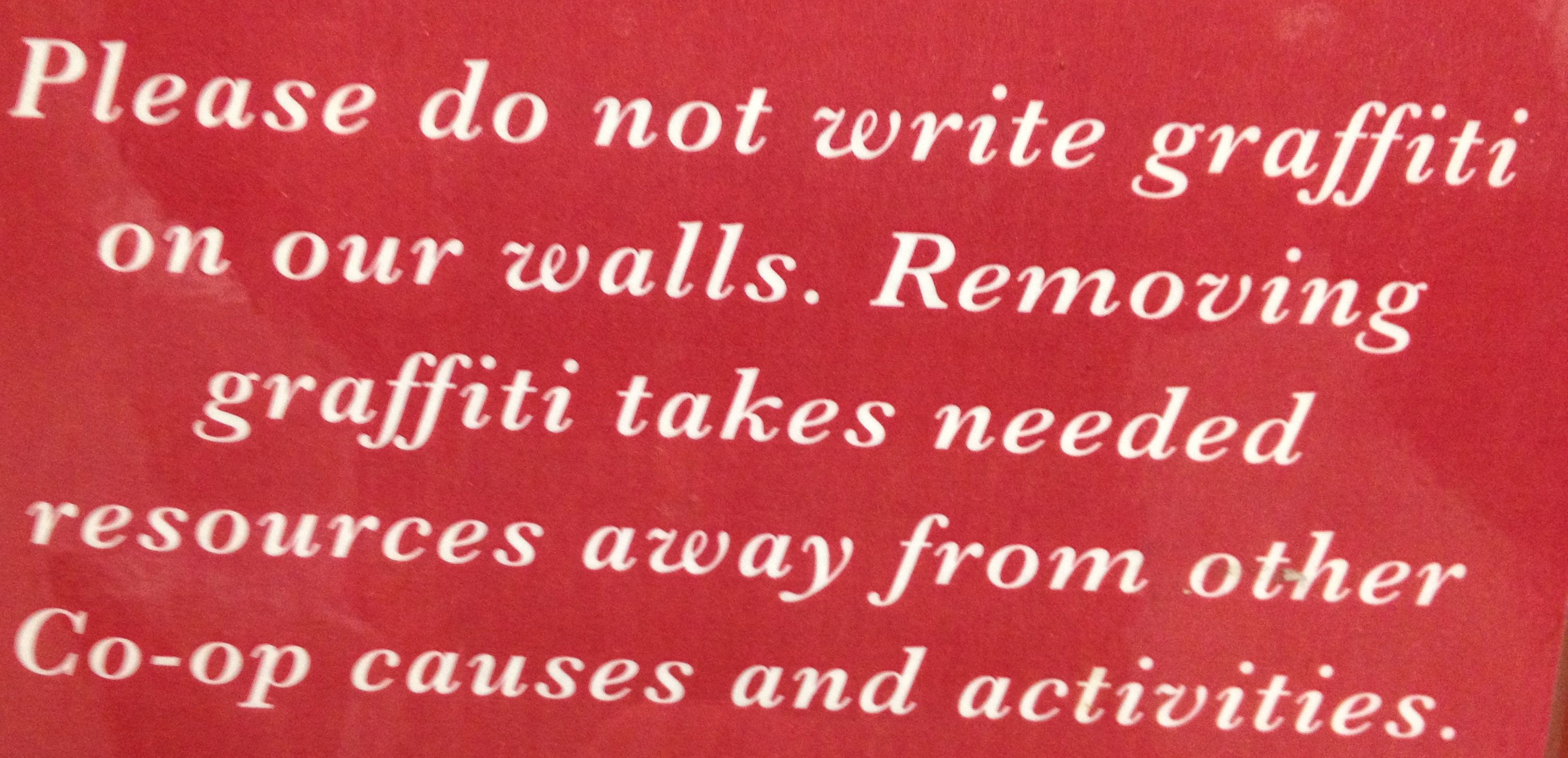 I found this sign in the restroom at the Sacramento Co-op. It is fairly effective at explaining why their specific audience, co-op members, should not prioritize writing on the vast red canvas. Of course, resources and causes are more important than the snide, silly, ironic, or otherwise confessional comments people need to make.