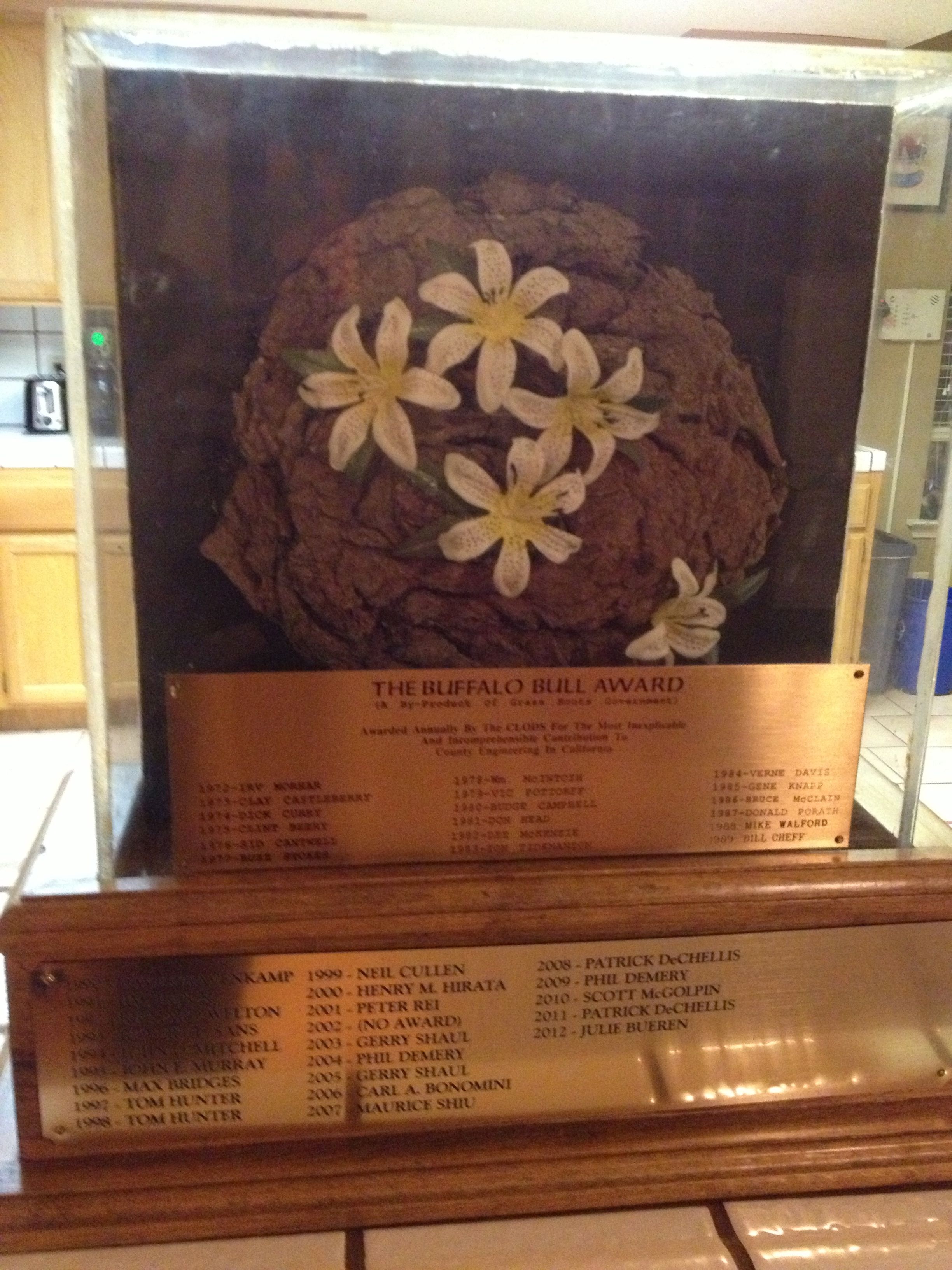 A cow pie in a glass box, it is not an award that anyone wants to receive, but a list of folks have, dating back to 1972: http://www.ceaccounties.org/Buffalo_Bull_Award.aspx?print=Y.