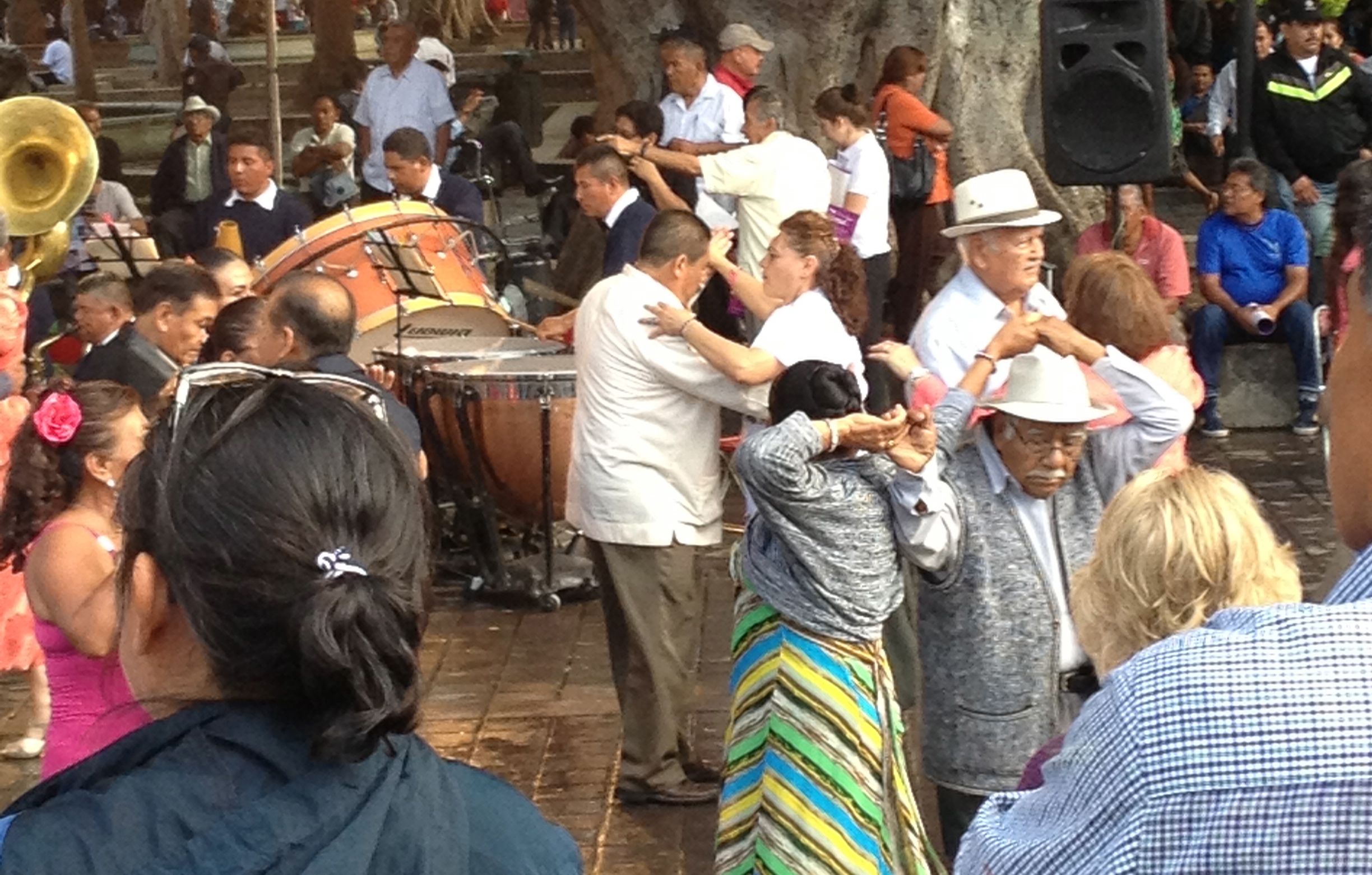 Usually on Wednesdays I am running back from Tlacochahuaya at just about the same time the band is wrapping up and the people are no longer dancing under the great laurel opposite the cathedral on the zocalo. However, tonight, once I was in dry clothes, I had the chance to watch the crowd of dancers and the crowd watching them. It is always a treat to see these folks dancing as most are real partners, not performers. The dance together because they love dancing together and their dance is beautiful because of the way they look at each other as they are moving together.