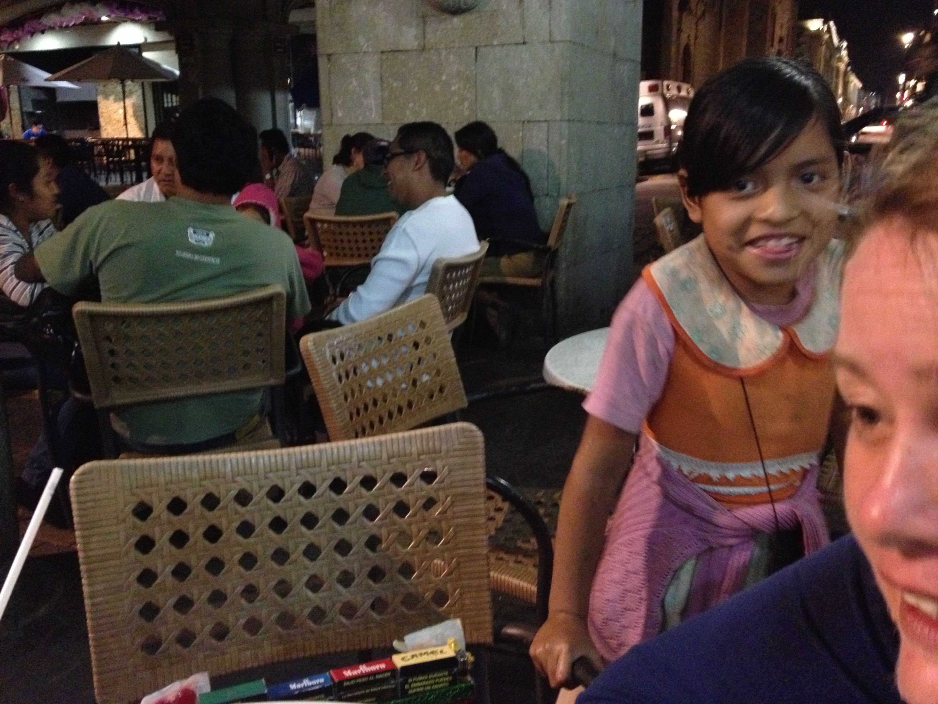 Due to rain and other things, it had been a few days since I had a chance to hang with the Little Businessman and Co. on the zocalo, but we made up for lost time last night. We had coffee and cake and ears of corn (elote). We clowned around, using our corn as a sword and fighting each other gently, so that all of the mayonnaise and cheese and chile didn’t get knocked off onto the ground. Cecilia and Augustino put whipped cream on their faces, and Mateo and I documented it in photos. We tried to devise funny jokes, but we weren’t very good at it (too much is lost in translation, especially since Spanish is a second language for all of us). And, we recorded ourselves naming things in Spanish and English: “This is a spoon; this is a straw; this is a table, a plate, a light, gum, suckers, cigarettes.”