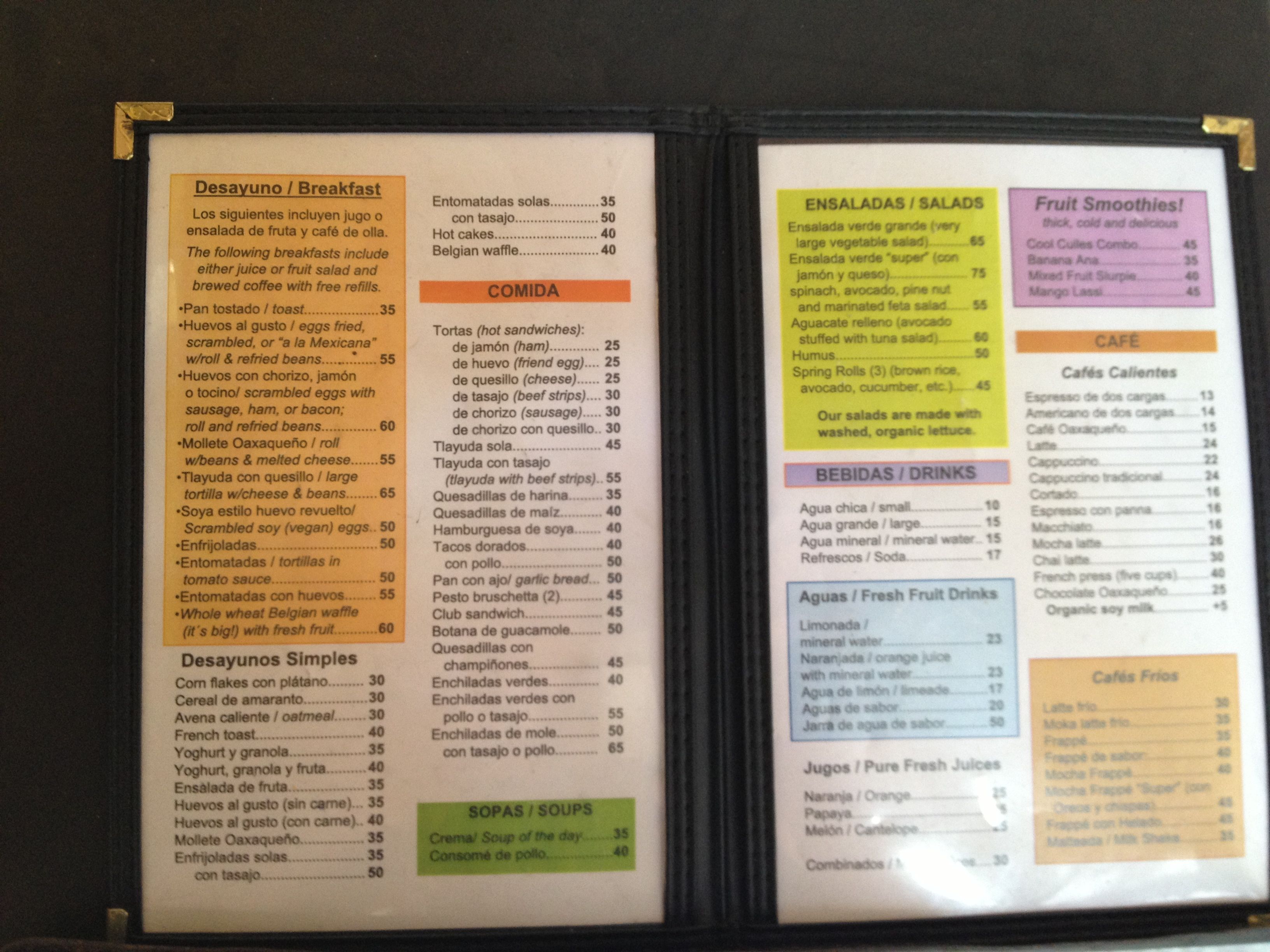 Cafe Los Cuiles is one of the few cafes open on Sundays here. It has an excellent organic menu. I know from a past visit, their breakfasts and hummus (the hummus arrives hot, freshly made with bread or tortilla strips; pick bread) are delicious.