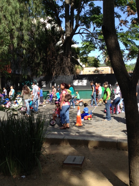 On Saturday morning, a group stopped traffic as they were marching to encourage traffic to slow down and think of the children trying to navigate the crowded streets of Oaxaca. At first, I couldn’t tell what it was, but then I looked inside the lane of marching parents and saw the congestion caused by the bicycles with training wheels, toy cars, wagons, and tricycles.