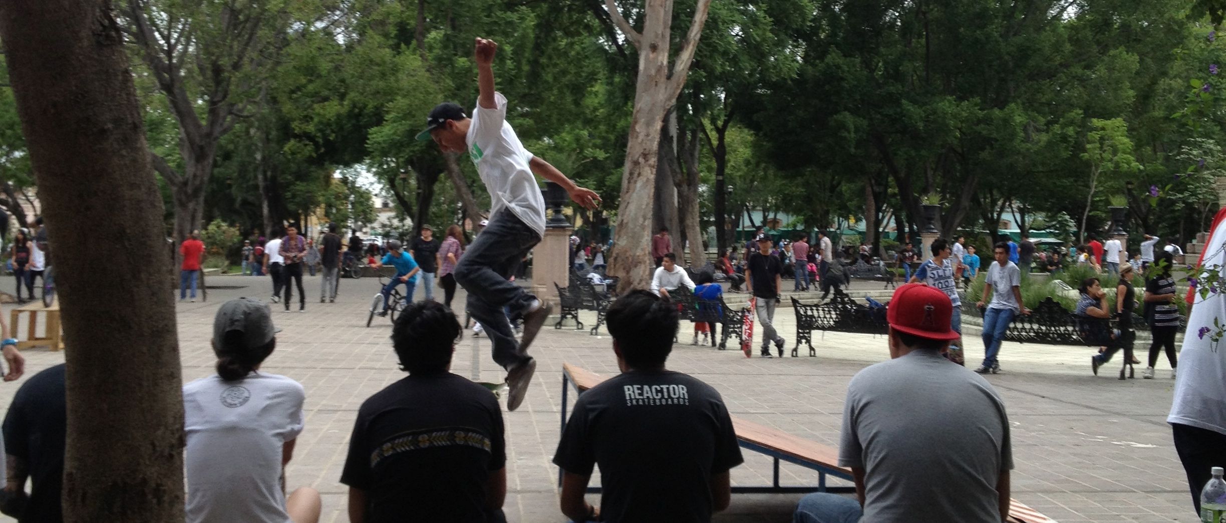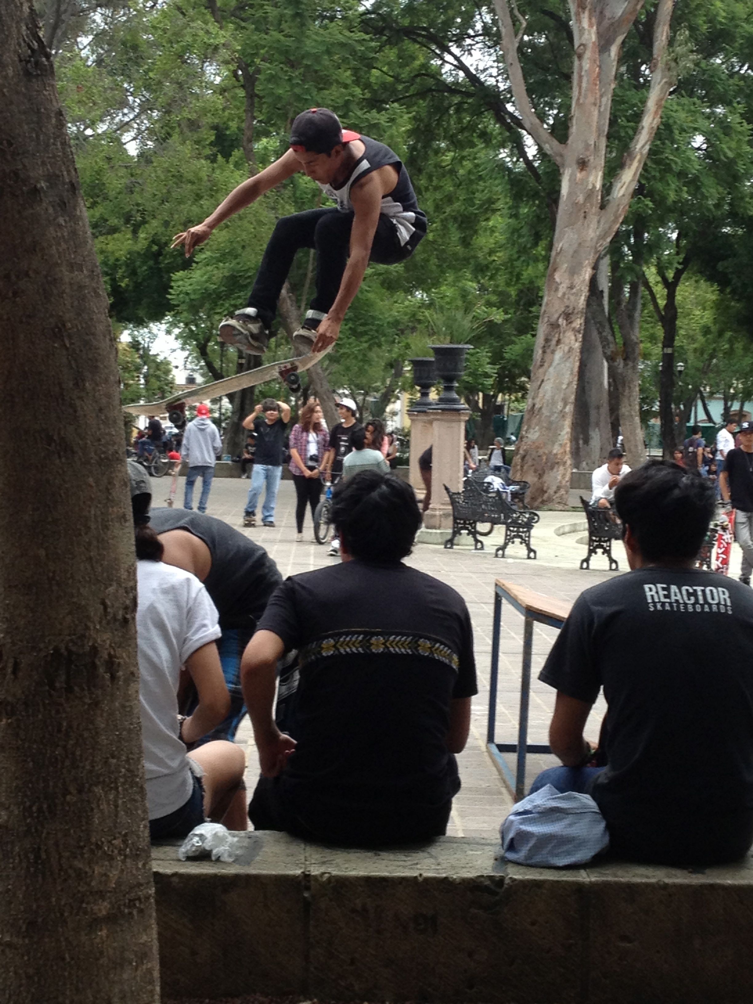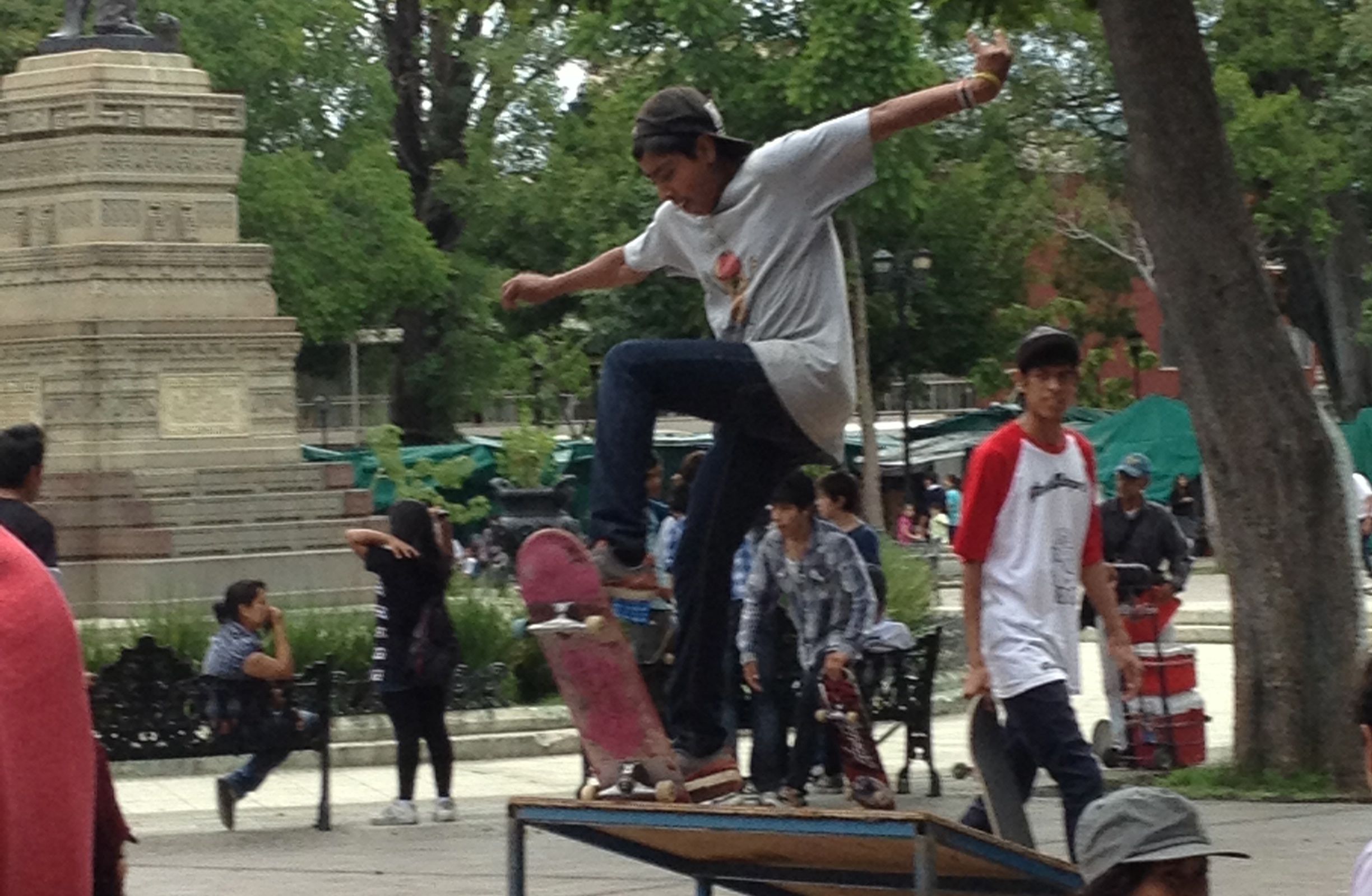 Okay, I’ve already admitted that I am not the greatest photographer. I’m too slow, unprepared, and so on. However, during the market in Llano on Friday, I found a group of skateboarders and learned to listen for when they hit the front of the metal ramp they were racing onto. Hearing them connect, I would wait two seconds and then snap. The result is a collection of young men — like the cahuetes (fireworks) here — rocketed into the sky for brief seconds before landing (or not) on their skateboards.