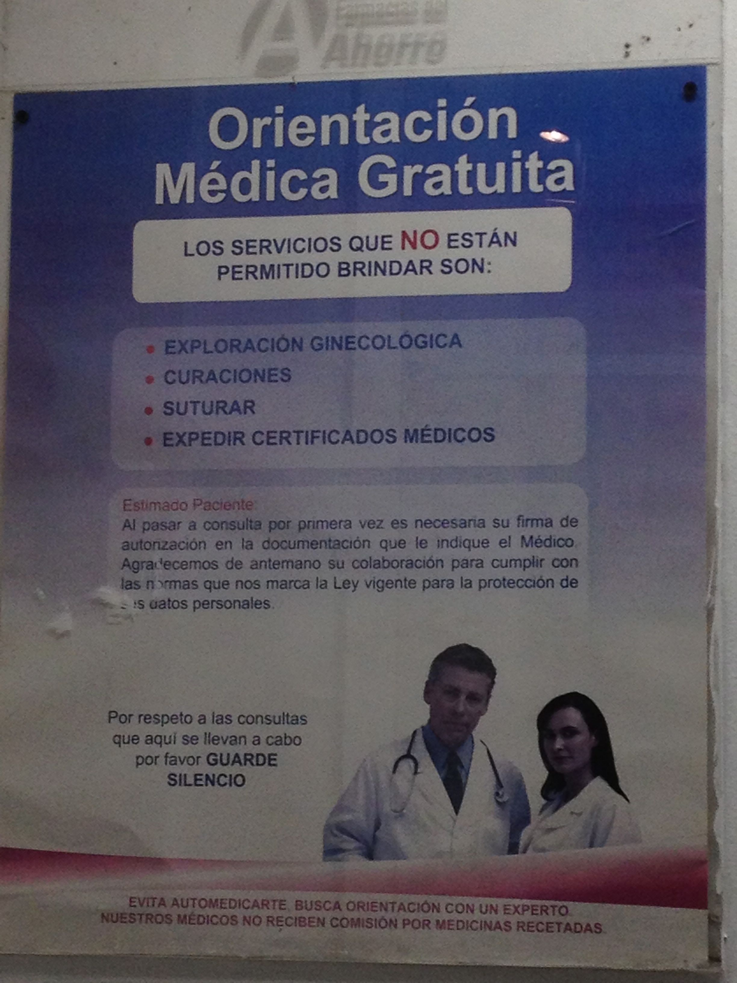 With only 150 pesos in my pocket, I told her I’d see what I could do. I went up the pedestrian street, Alcala, to a pharmacy I remembered, Ahorro. I told a very nice lady that there was a woman on the zocalo with tooth pain, and I asked if she could recommend something. She said she could, but since the medicine wasn’t for me and she didn’t know if the woman had diabetes or high blood pressure, or God forbid something else, she suggested that we go to the free doctor at the Ahorro on Higuera. It was 9:05; we had until ten to get there and be seen.