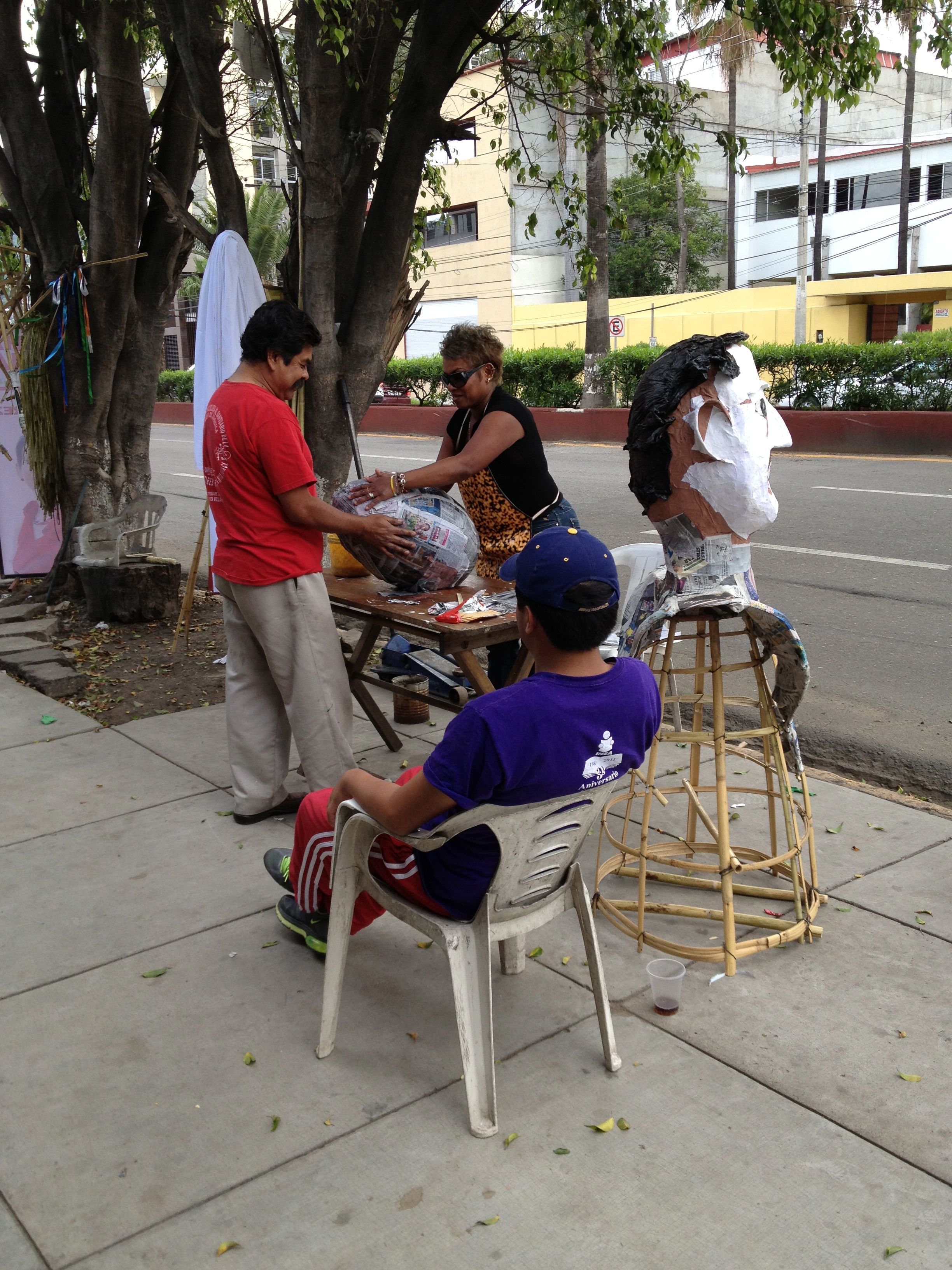 On the way to the stop to get the bus to Tlacochahuaya, we often see some of the giant dolls used to represent the brides and grooms. On Monday, we took a picture of the bride (just her torso through head) on a motorcycle. This evening, as we were taking photos of a new set of four heads they were working on, one man, in English, said, “Come with me.” He put the doll on and began moving it around and chanting, now in Spanish, “Bienvenidos a Mexico” (Welcome to Mexico). I went to put my camera back in my pocket, and he cheered, “one more.” I took a couple more shots to make him happy.