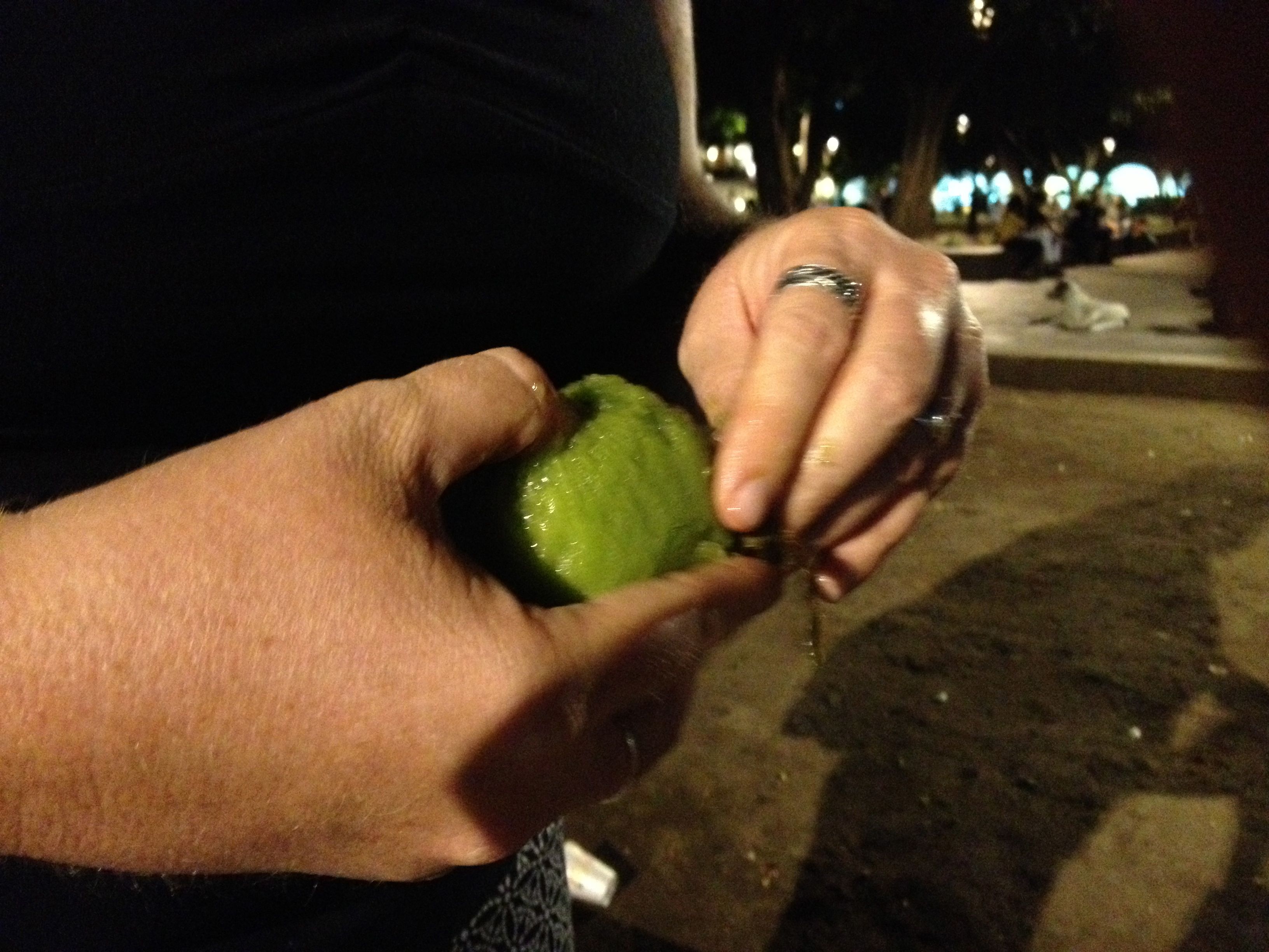 Cecilia was in charge of the bags and decided who would get what. She pulled a kiwi out of the bag and demanded to know what it was and how it ought to be eaten. I told her its name and showed her how to peel it with her fingernails. She gave up and I peeled hers, Augostino’s, and another for a boy named Coco who had joined us. Mateo wanted to make sure there was one for him later as he was eating one of the apples. I assured him there was. He didn’t know what an apricot was. Now he does, even though he insists it is a little peach.