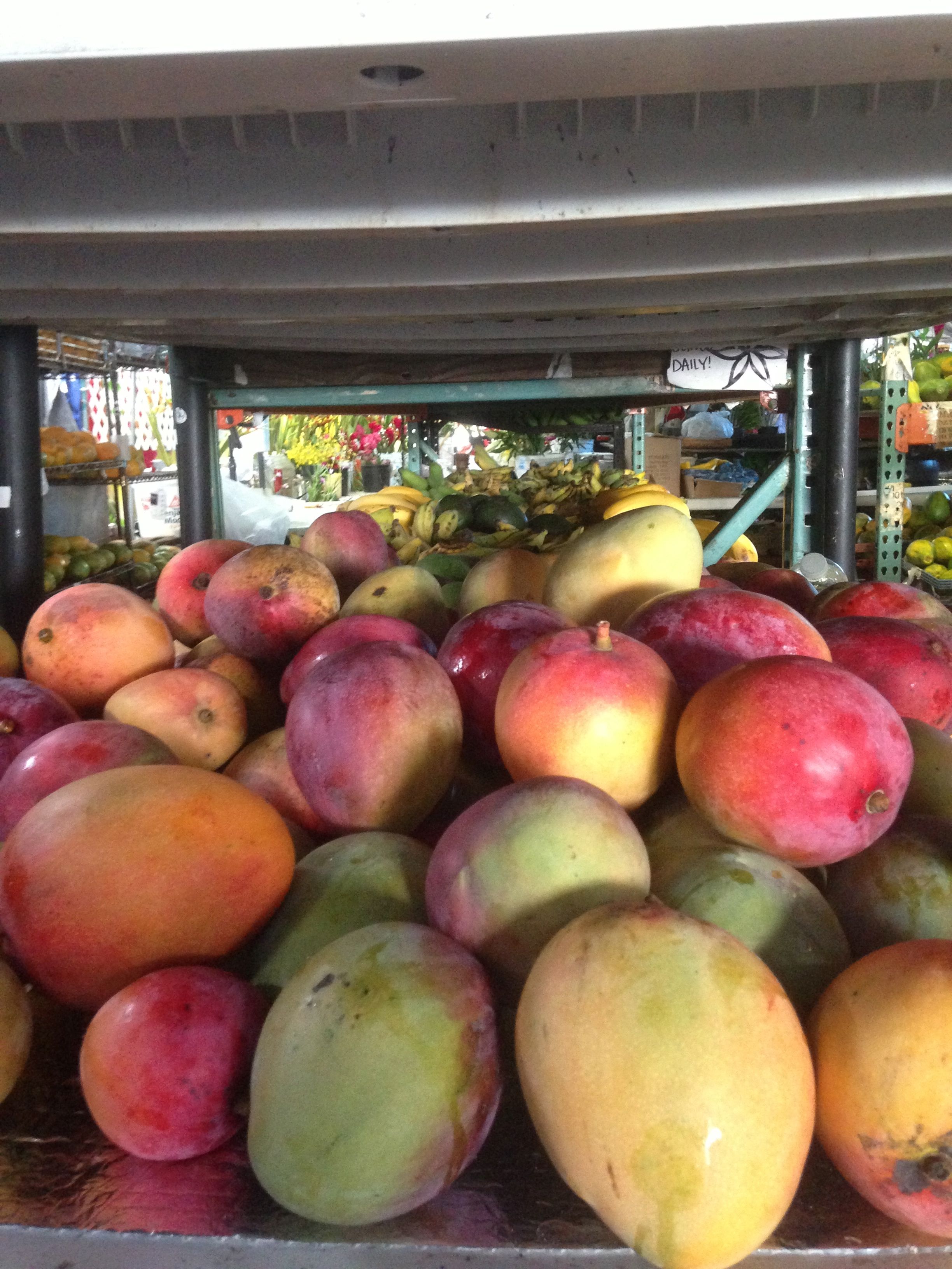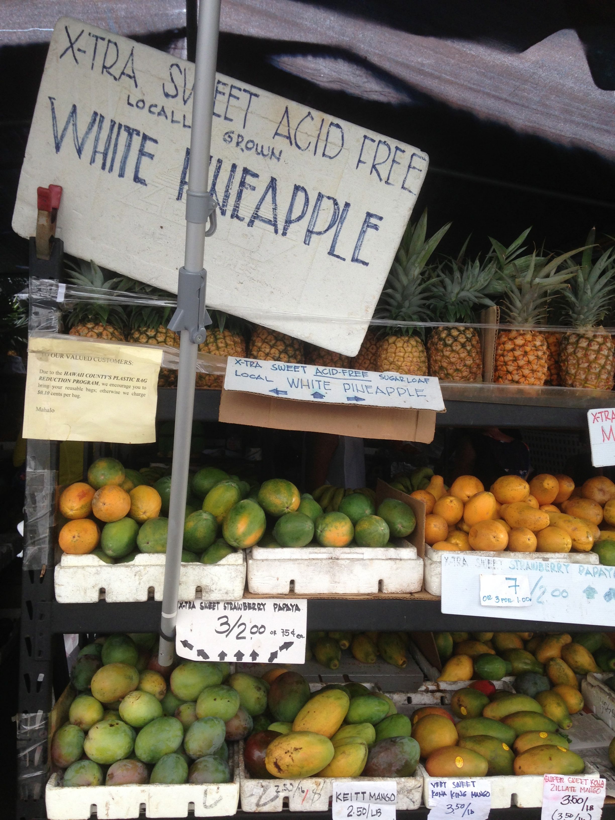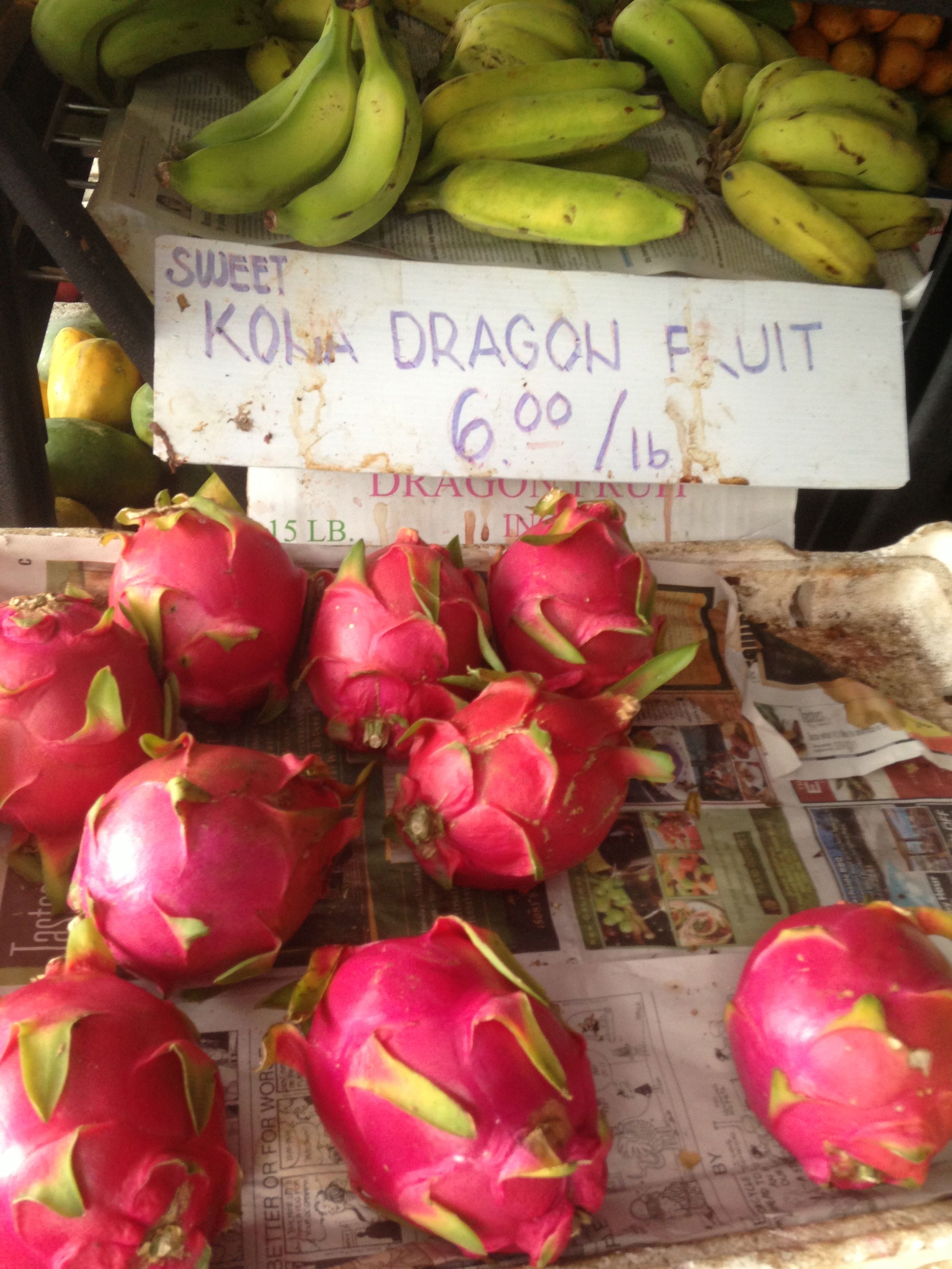 Just up from the Kona Farmers and Crafts Market, located on Alii Drive in the heart of Kailua Kona, (we’ll check this out later), we found a produce market (and some other vendors of mostly jewelry, sarongs, and souvenirs) under a cluster of black tents.
