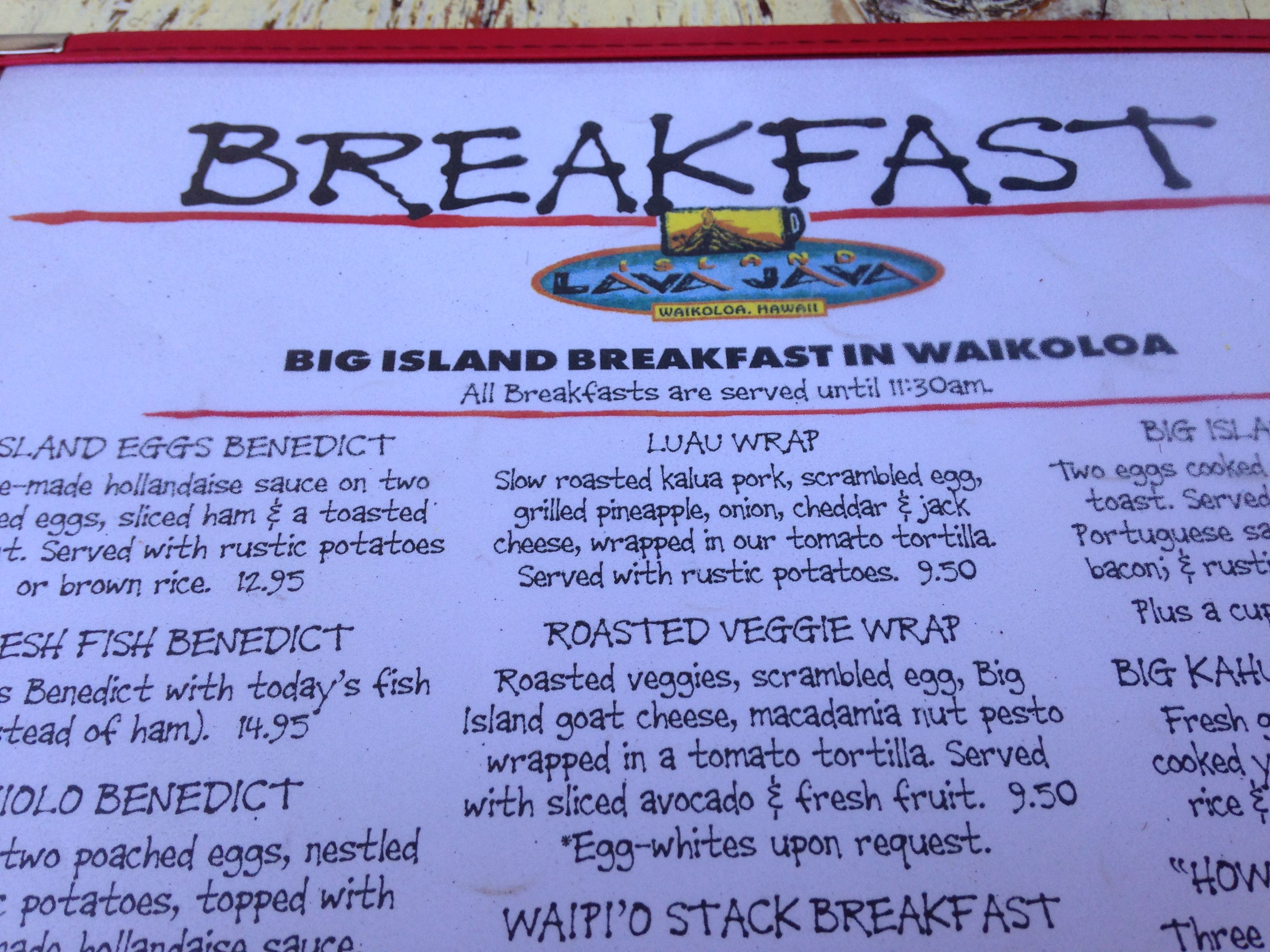 Waikoloa Village, off Waikoloa Rd. has a few places to dine, a municipal golf course, a KTA grocery store, a post office, and more. The other morning, out of butter and eggs, we decided to head to the market there. We were hungrier than we’d realized and searched out a breakfast joint.
