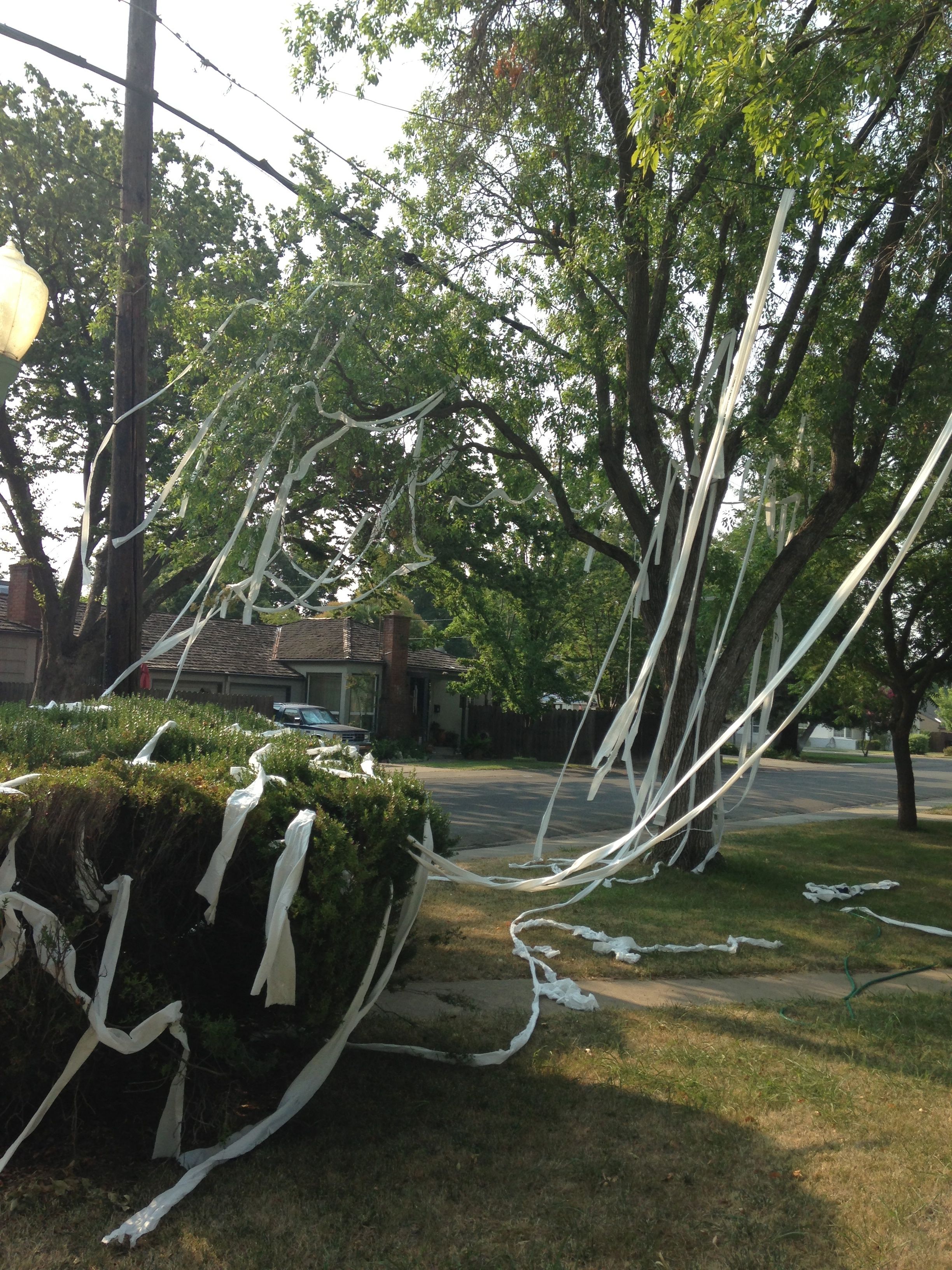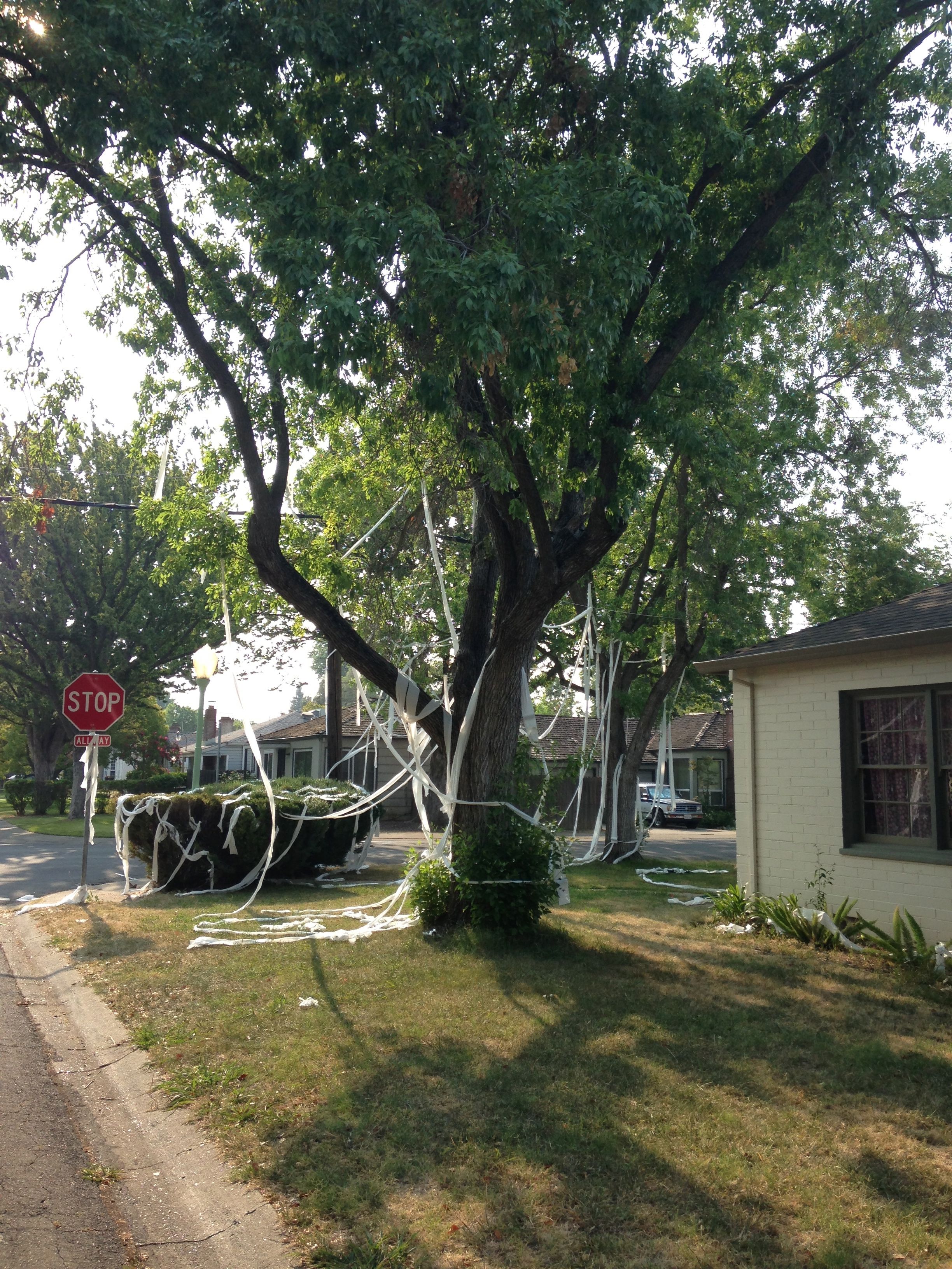 A neighbor’s yard was TP’d. Amazed by the abundant streamers, I wondered what provoked the chaotic ornamentation.