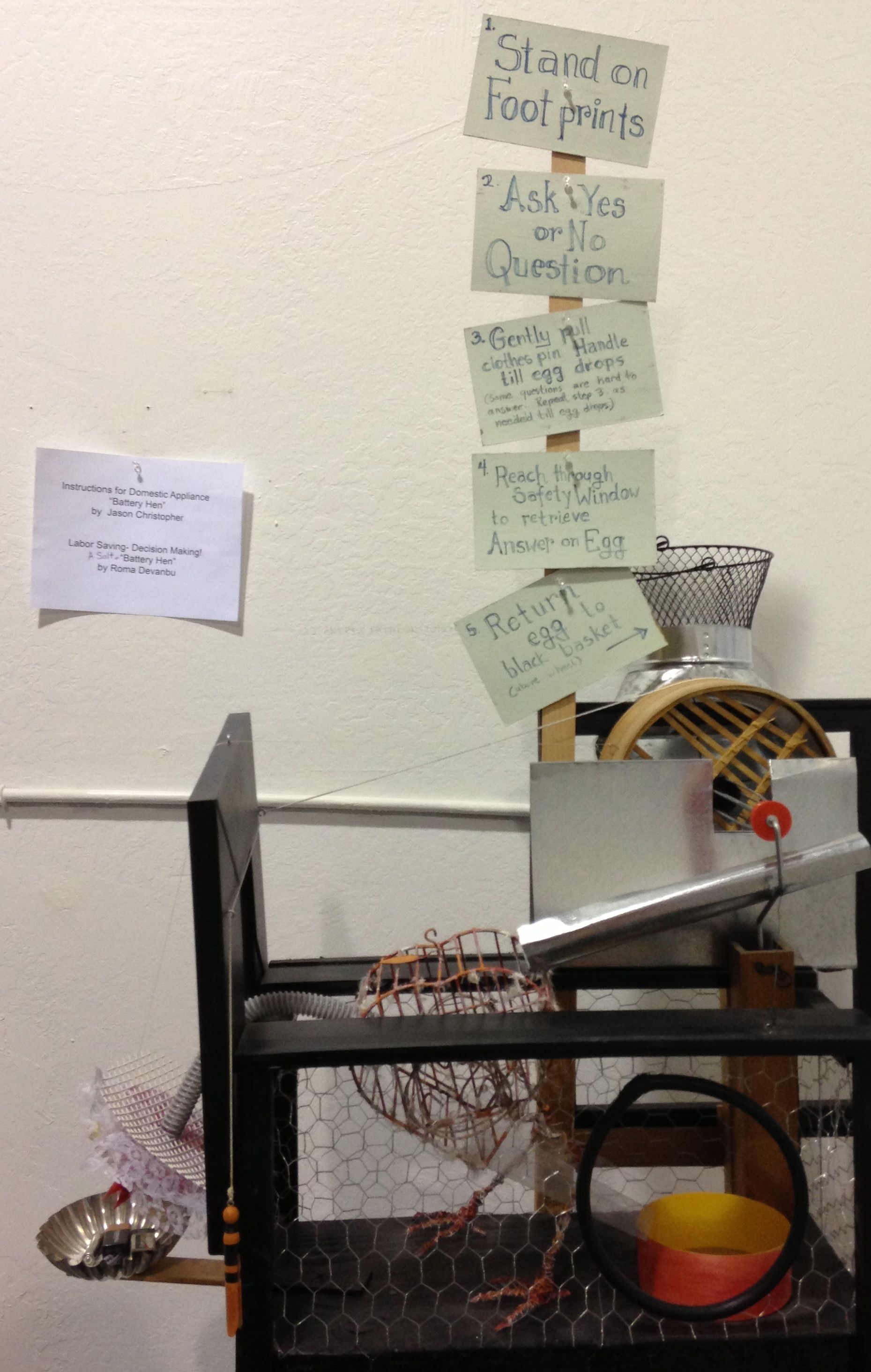 The other night we went to a groundbreaking for Verge Center for the Arts (http://www.vergeart.com). One of the art pieces is titled: “Battery Hen.” The piece is described as a “domestic appliance” that is for “labor saving decision making!”