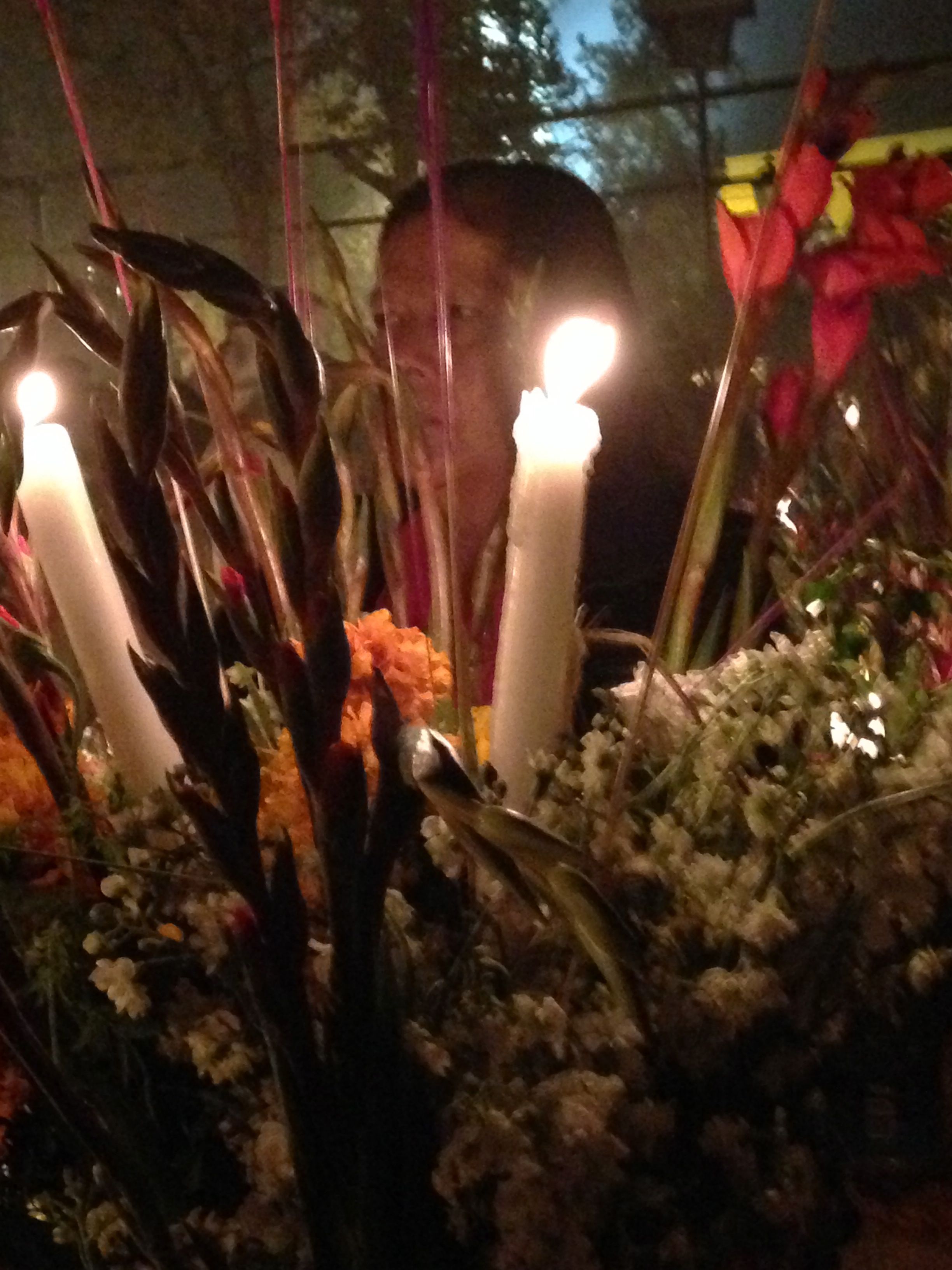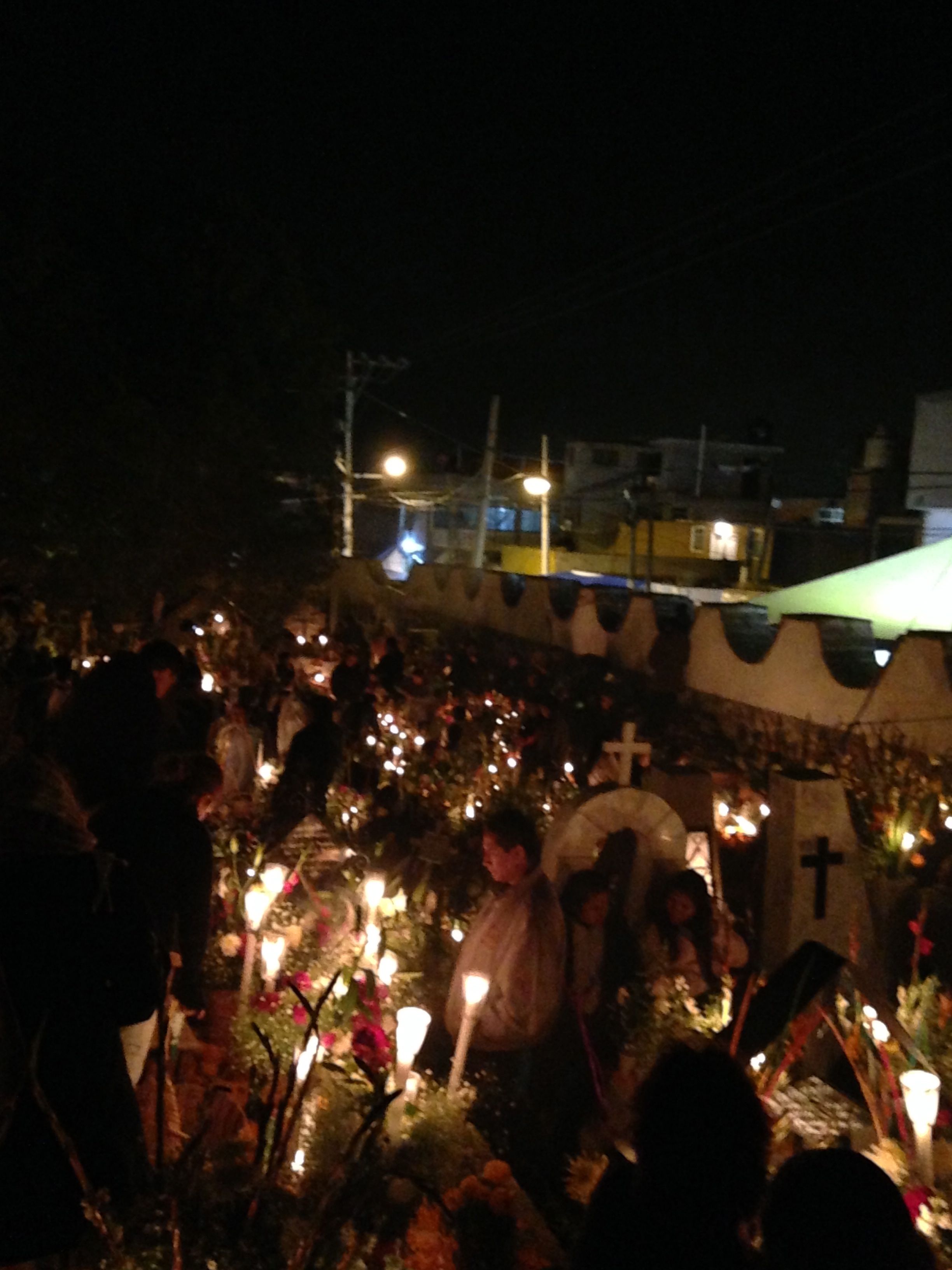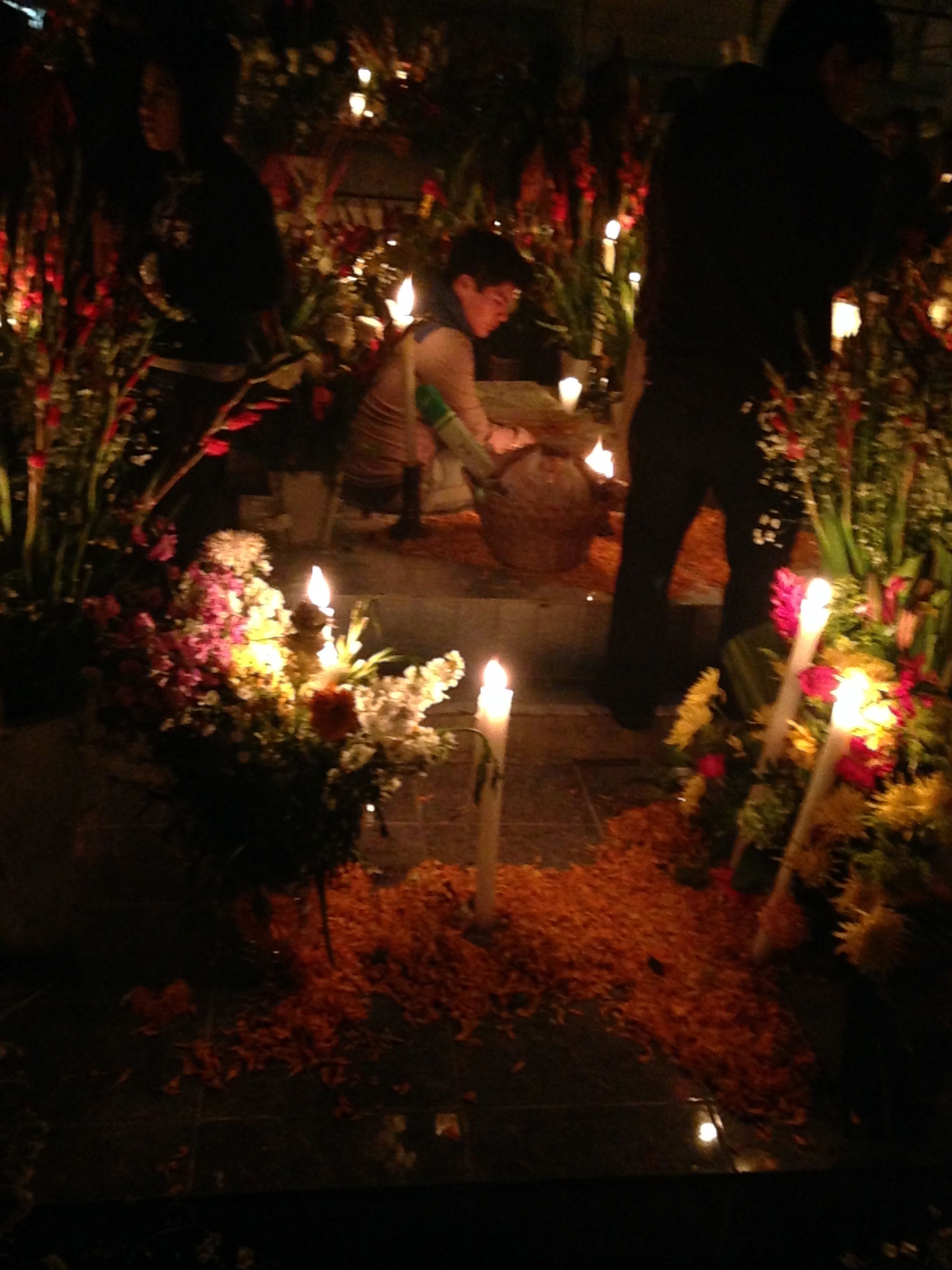 We navigated through the labyrinthine cemetery to observe families huddled in celebration of their deceased loved ones. The cemetery was flooded with the light of thousands of tapers, and the pathway was so tight in spots I felt my pantlegs might ignite.