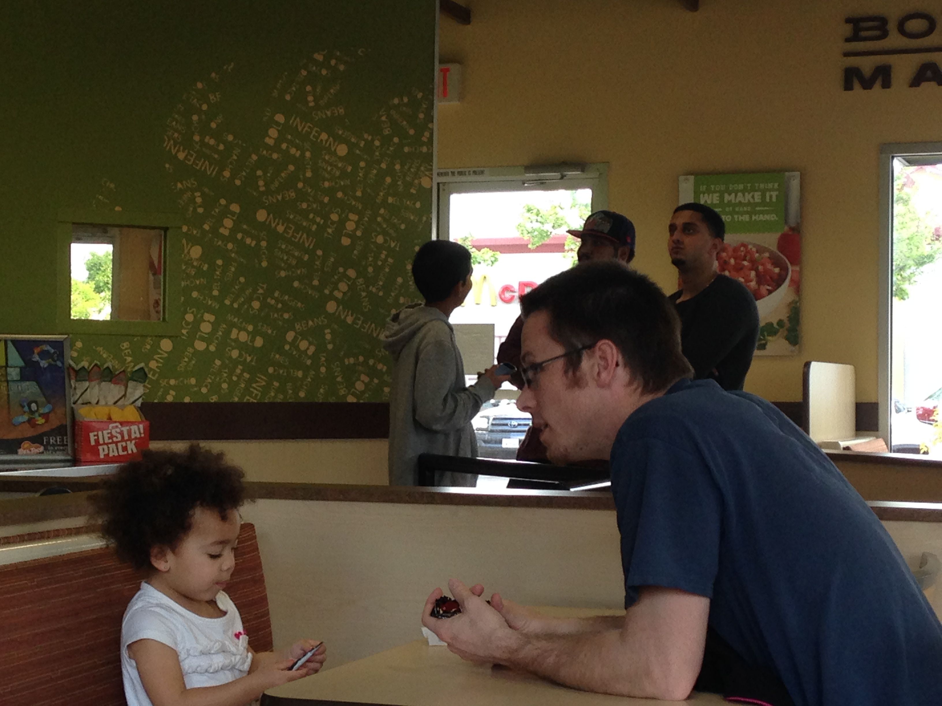 A table of three black men stared at the man across from me teaching his daughter to count with salsa packets. I stared at them staring at the family.