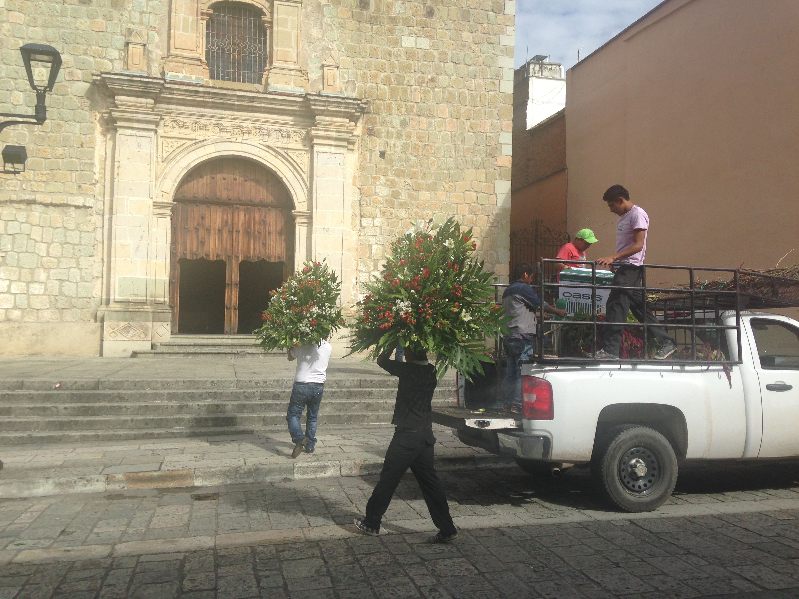 A truck filled with mostly red flowers emptied into the Iglesia Carmen Alta.