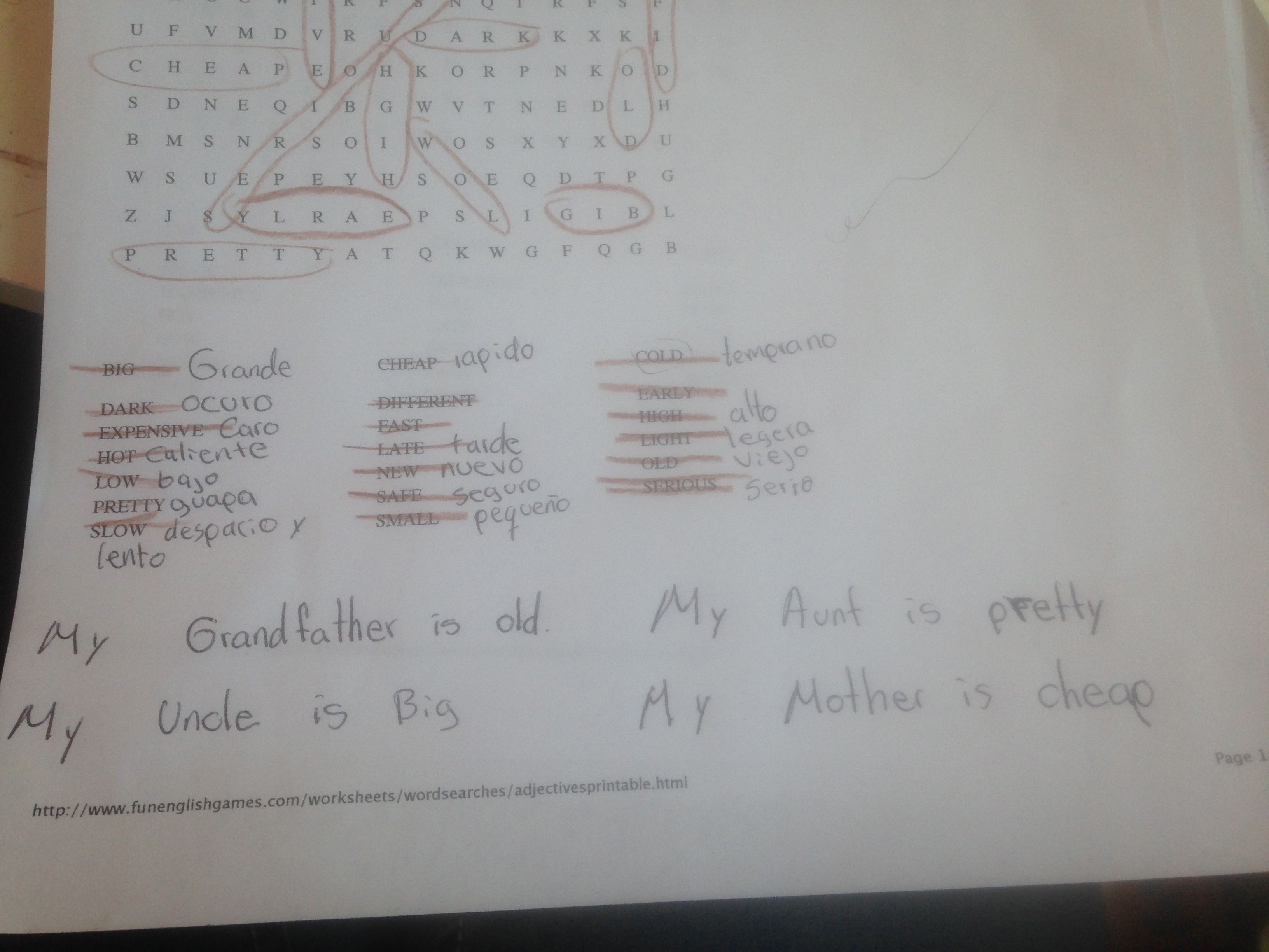 Instead, we labored on, practicing pronunciation, trying out sentences. Cristal, second from the left, was not in class on Monday when we reviewed the adjectives for the first time. However, when I asked them to concoct two sentences to use in telephone. Cristal drafted four: