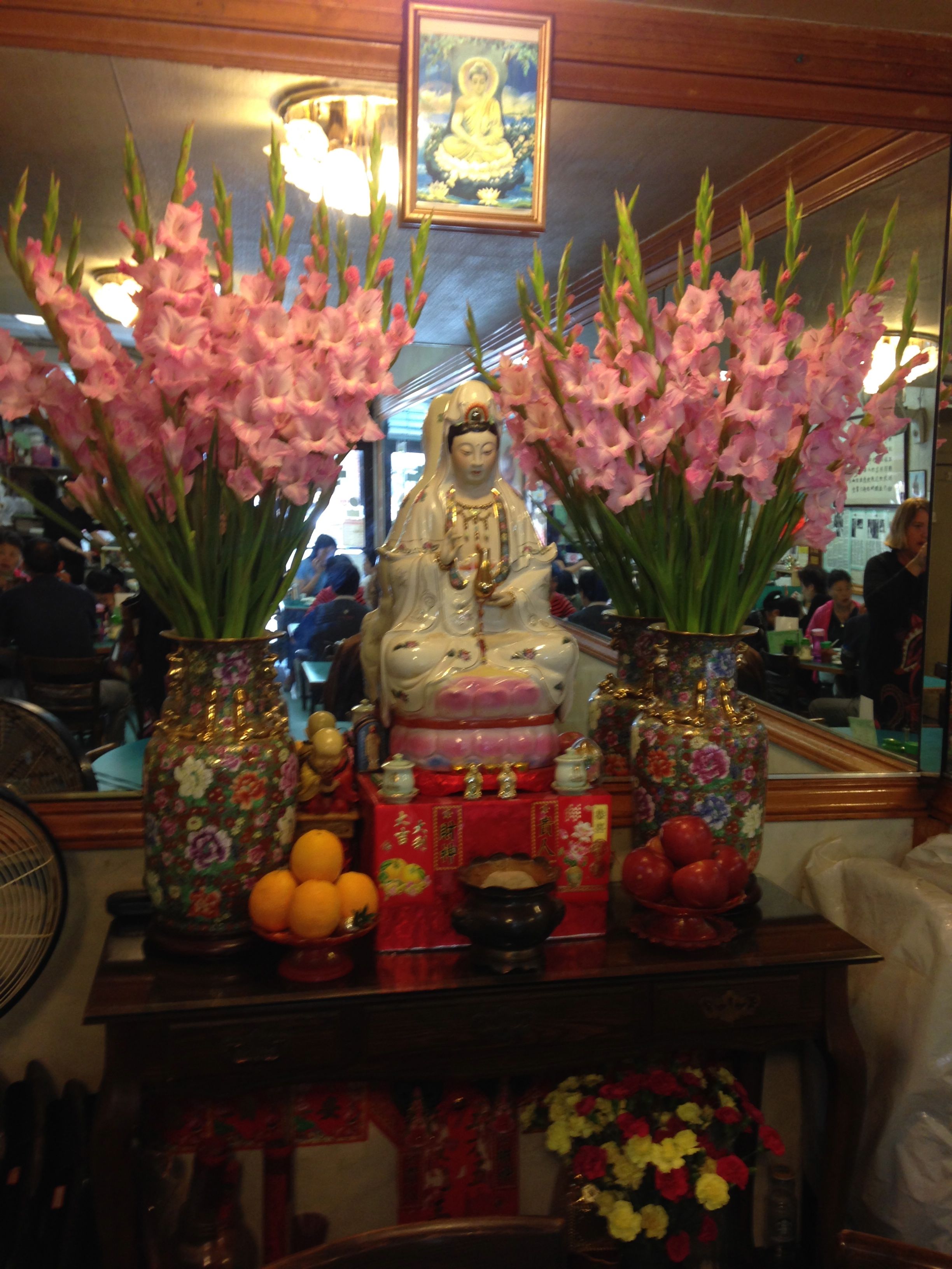 Let’s say gluten meat and piles of vegetables don’t sound appealing to you, the altar at the back of the dining room is captivating. Amplified by a mirror on the back wall, it features Guanyin (aka Kwon Yin), the goddess of mercy and compassion, fruit, and flowers. The proprietors are especially pleased when tourists appreciate their loving tribute to their ancestors.