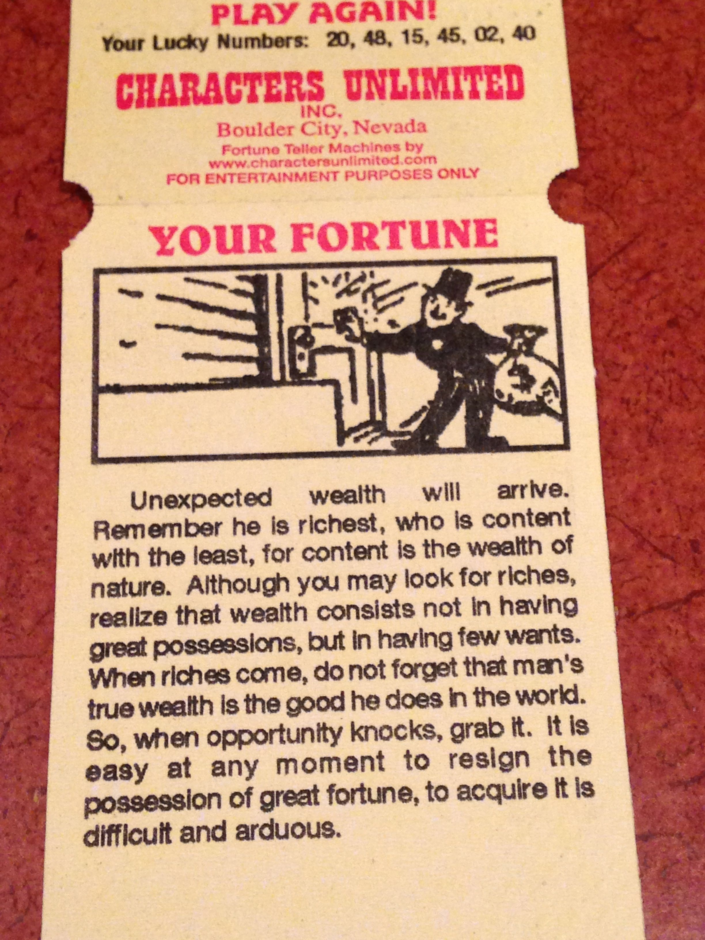 I put a dollar into the Zoltar machine, and I was delighted when Zoltar spoke. His handsome voice warned: “He who laughs last thinks slowest.” As fast as I could, I guffawed as Zoltar produced a ticket forecasting my fate.