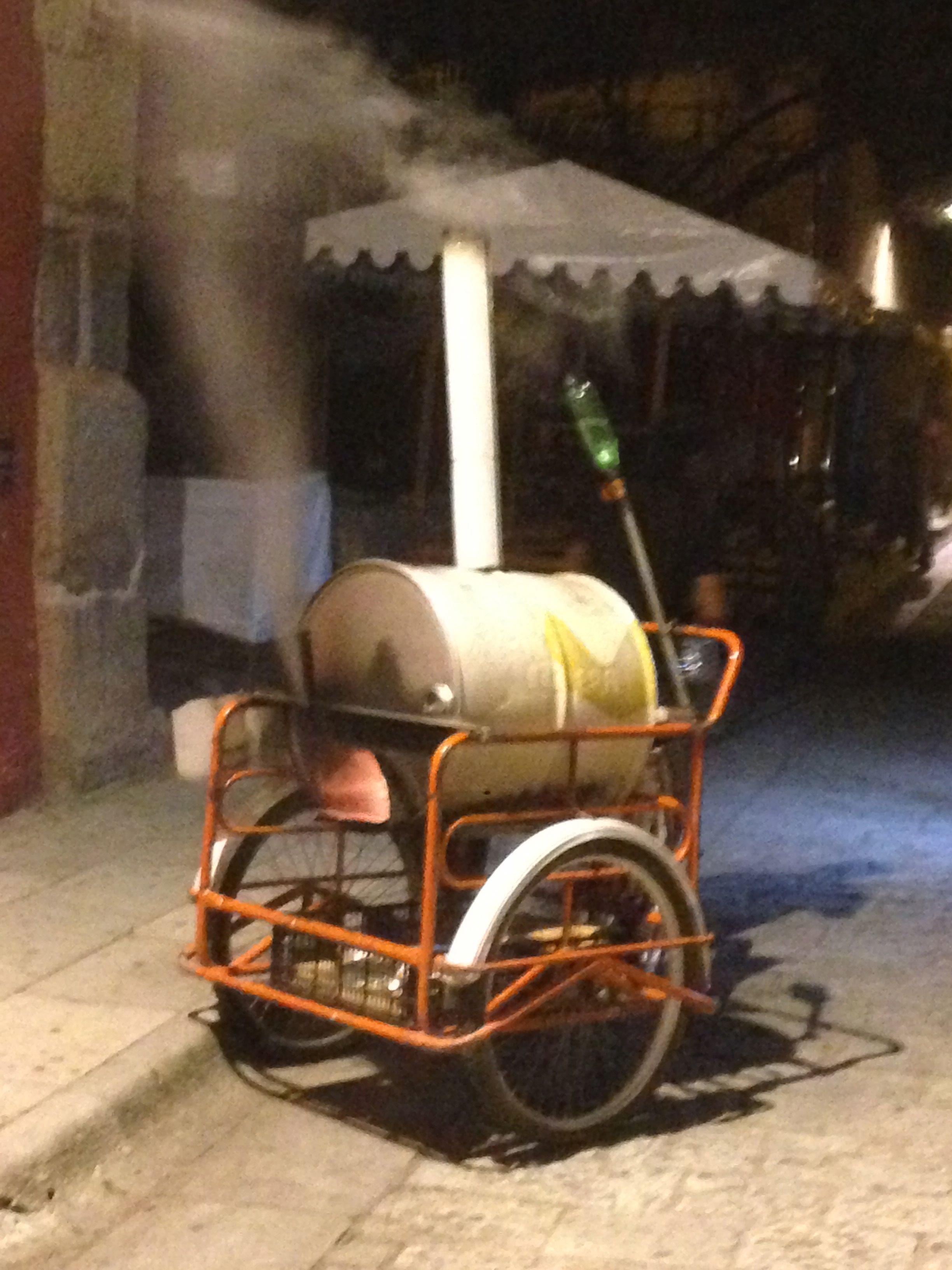 A man steams bananas in an old yellow drum filled with a fragrant fire he nightly bicycles around town. You can hear the barrel’s whistle as he releases hot steam into this darkness swarming with others, like you, headed home.