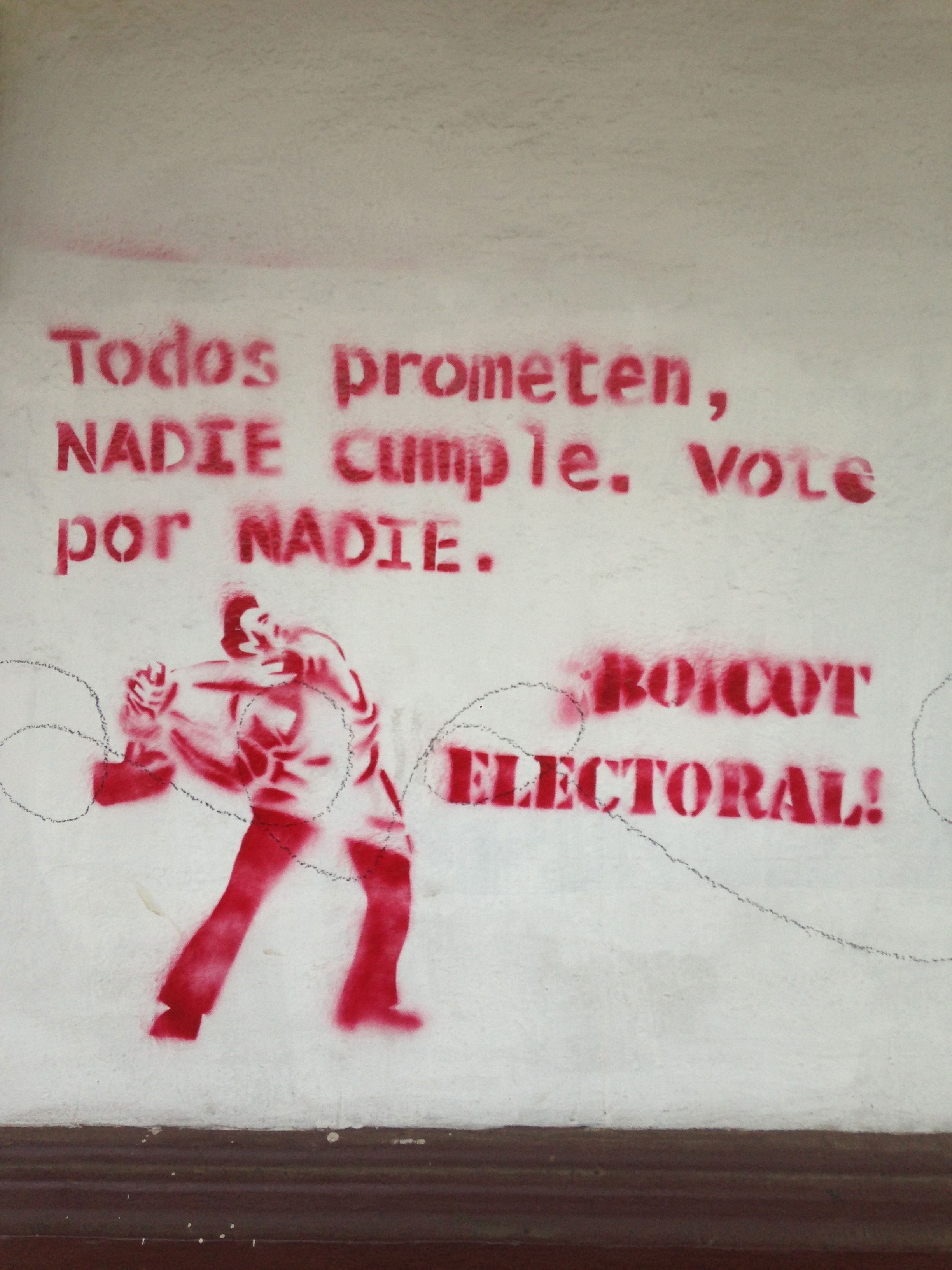 June 7, 2015June 5, 2015Boycott Voting Scroll down to content Translation: Everyone makes promises. No one keeps those promise. Vote for no one. Boycott voting. In the US, I tend disagree with this type of boycott. Here, I am not so sure. I need to read more. Share this: Click to share on X (Opens in new window) X Click to share on Facebook (Opens in new window) Facebook Like Loading... Related Published by shewhodaresnothing View all posts by shewhodaresnothing