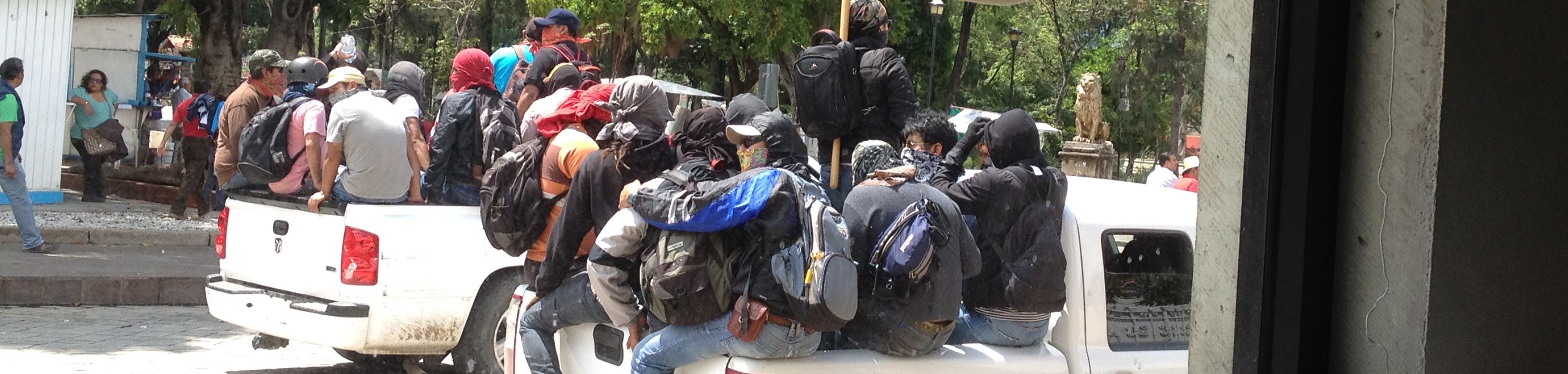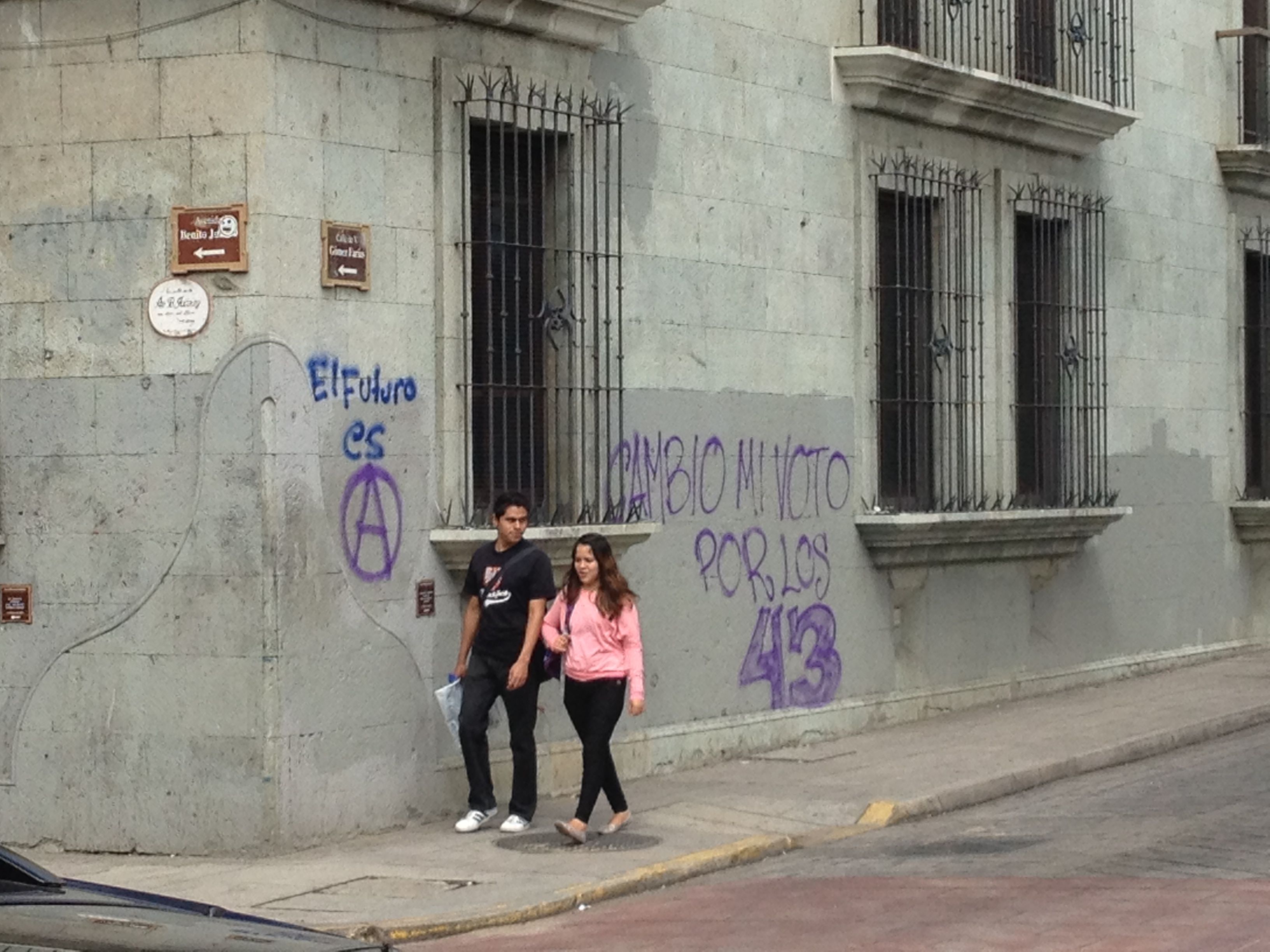 Marchers came down Benito Juarez, past Llano Park; from the restaurant’s window, we could see people with masks and sticks and slingshots. The management of VIPs decided to roll down the metal door, and we were sequestered inside as the teachers and others (including young anarchists with bandanas covering their faces) sprayed graffiti on the windows before us and tried to break the same windows with barrels.
