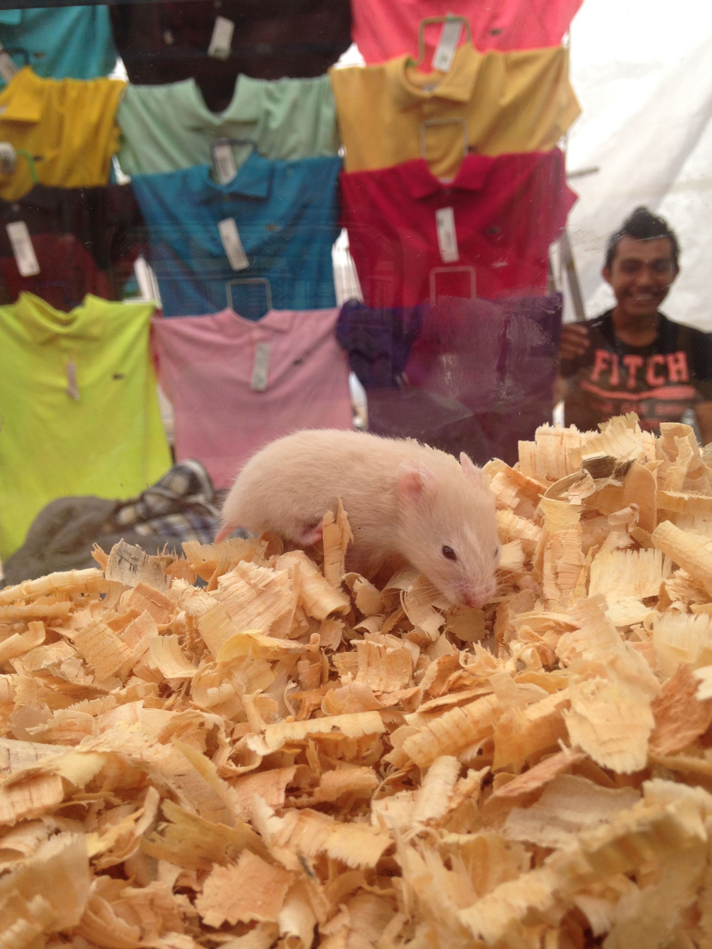 A young guy interrupted to ask whether they had mouse food in addition to fish food. The salesman explained that he could get some grains and veggies from one of the other market stands.