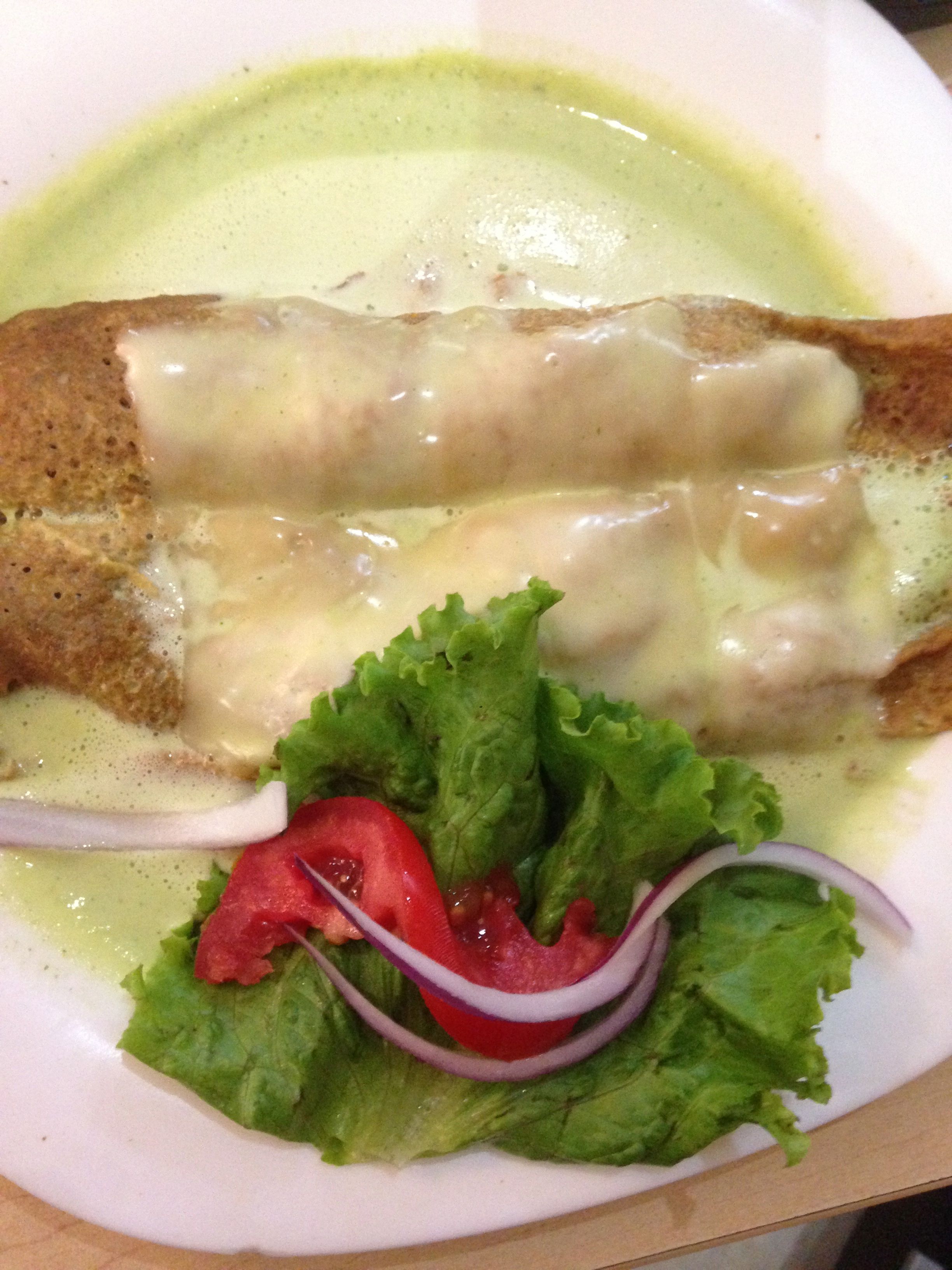 I know this plate looks suspiciously green, but it is a creamy luscious green the texture of latte foam, the earthy flavor of cilantro. I know a cilantro latte sounds disgusting to most, but after the mushroom crepes at Café Arabia in Jardin Conzatti, I would certainly be persuaded to try one.
