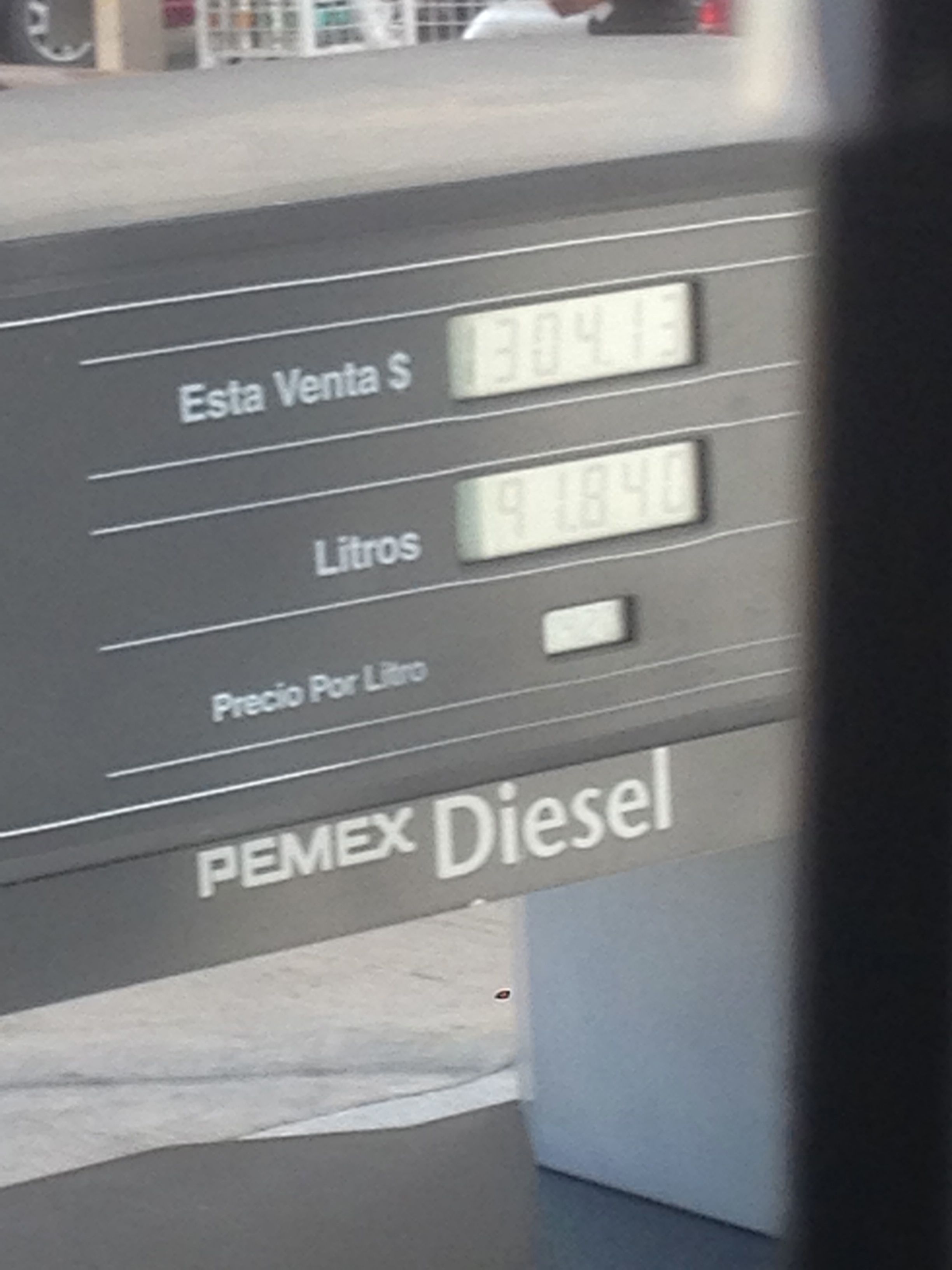 The sign on the pump finally landed on 1399.94 pesos for 98.58 liters, about 1 US dollar per liter.