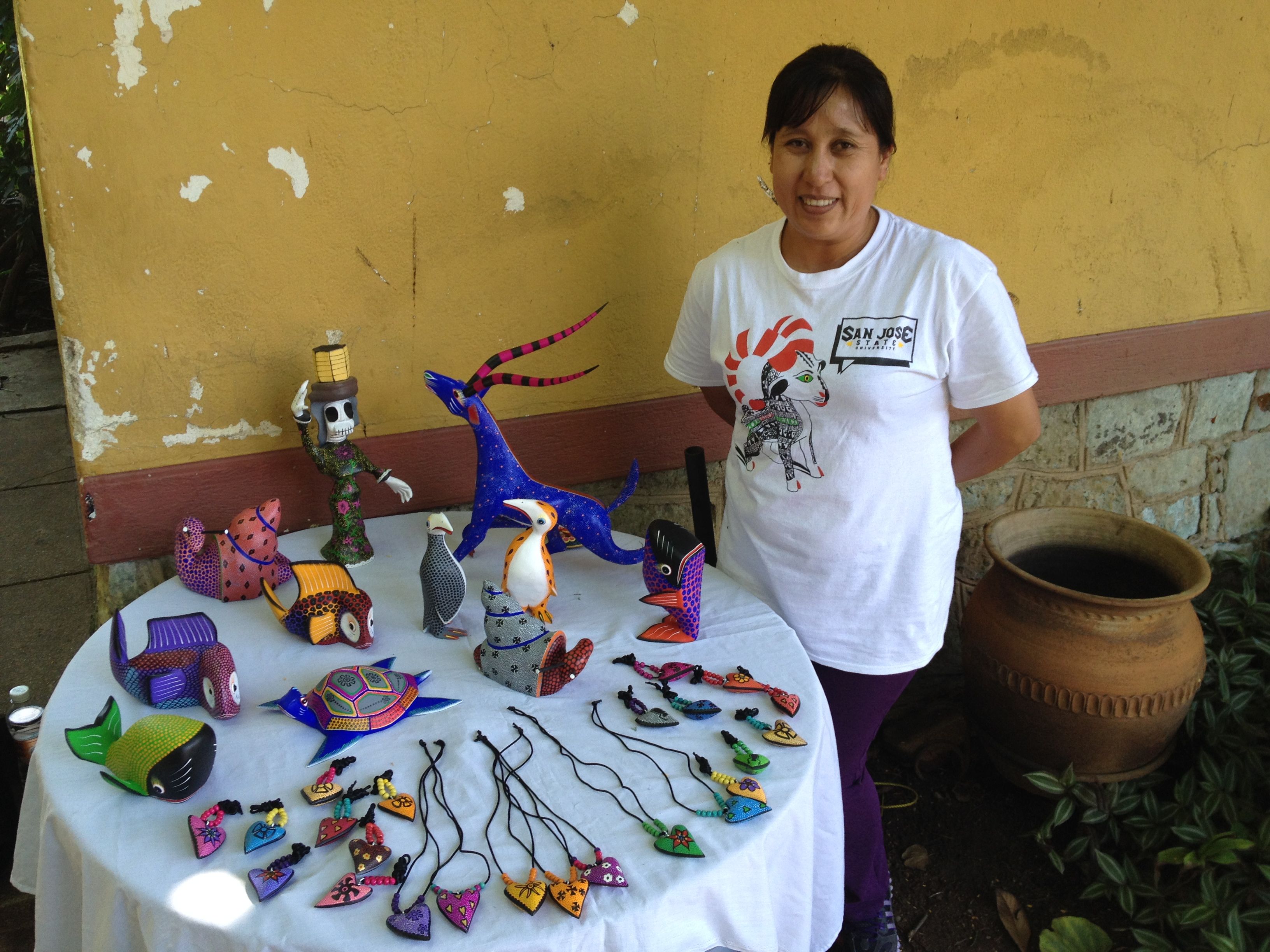 I went to find the alebrijes artisans at their stand at the Instituto Cultural Oaxaca. As I rounded the corner, I saw Leti and her beautiful work. She was happy to see me and said she had just been thinking that it had been a long time since we last met. I reminded her that it had been a year. She told me about their work in Arrazola, the depressed economy, and how she is working on getting a visa to travel to Northern California in the fall.
