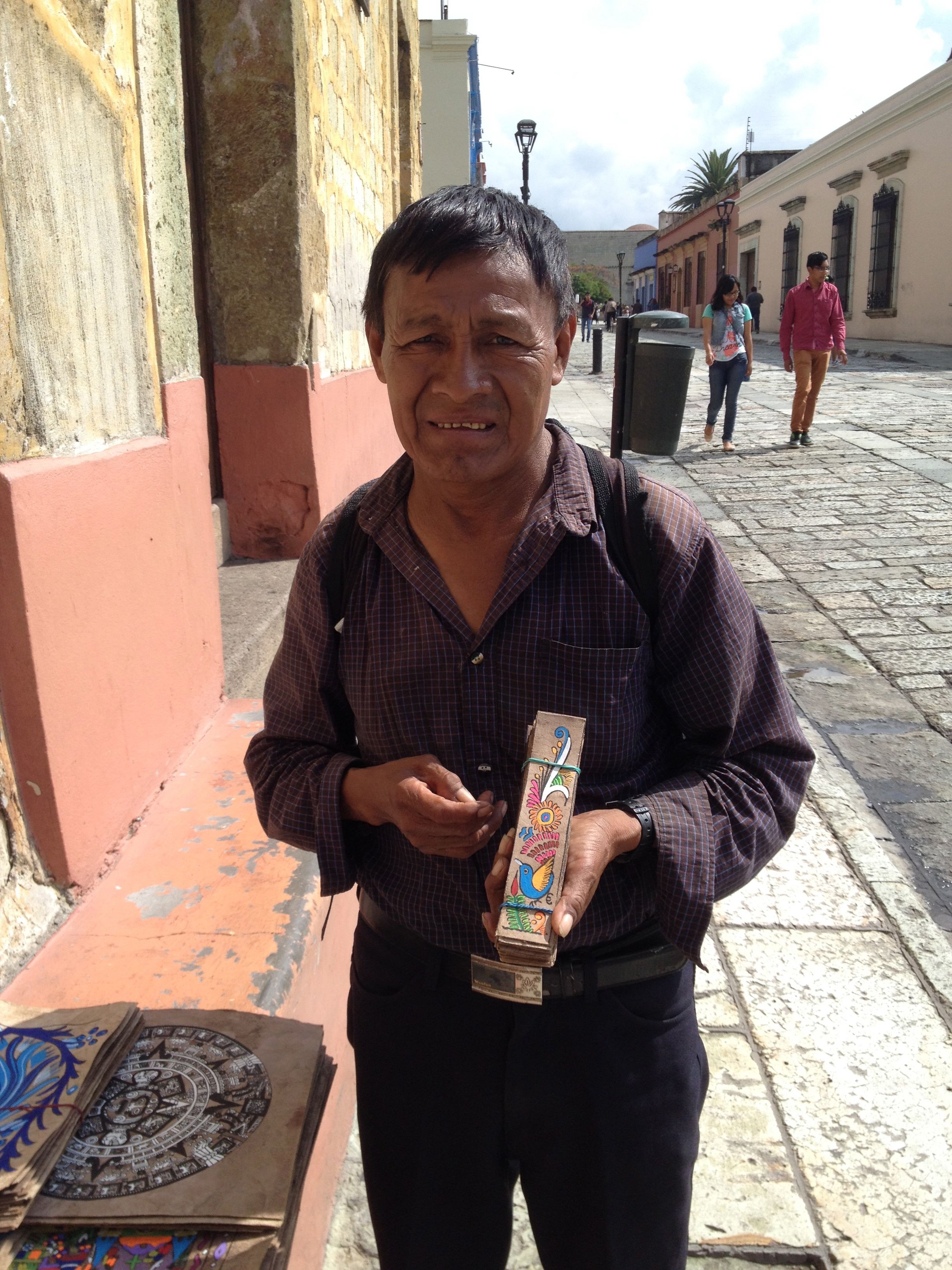 This man uses acrylic paint to create bookmarks and art to be framed. He walks up and down the pedestrian street all day trying to unload some of his pieces.