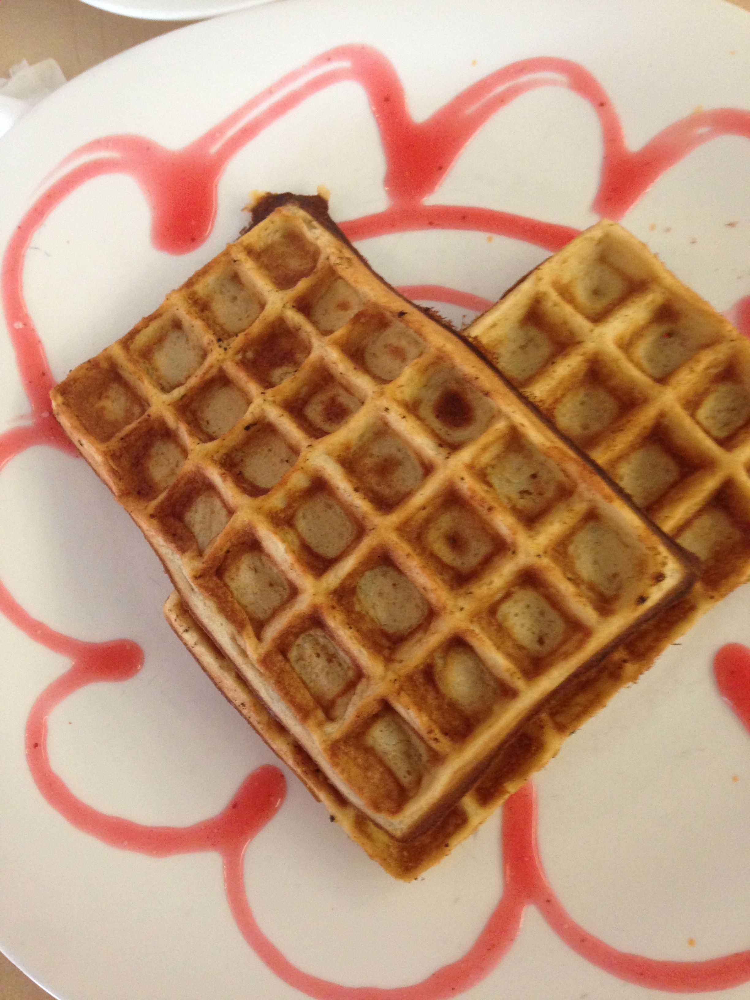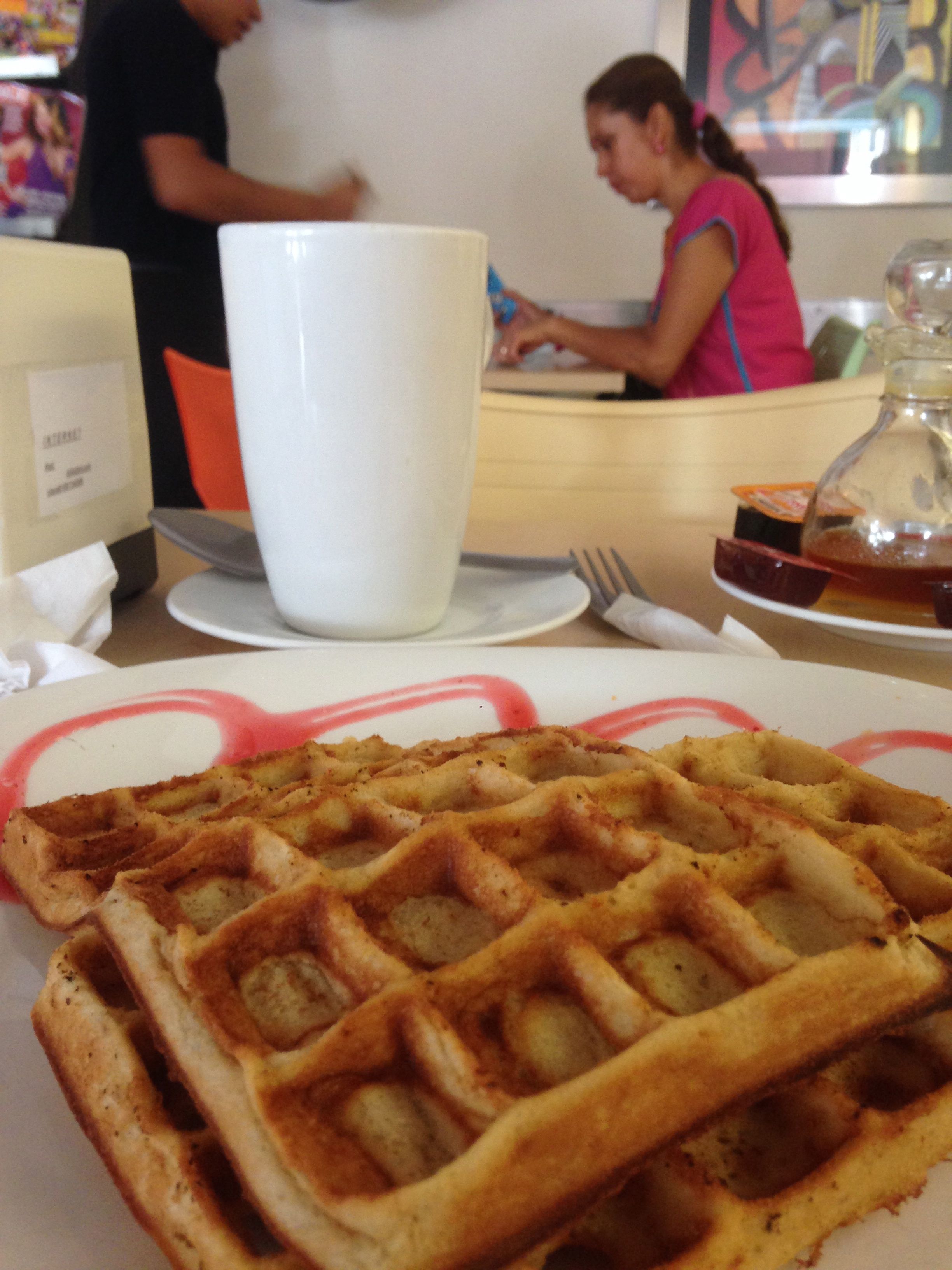 So the next mornining I went to Cafe Arabia and ordered one waf- flay integral with ma- play syrup. They gave me two in the shape of a sharp heart on a strawberry flower. I ate one and brought the other to Mari.