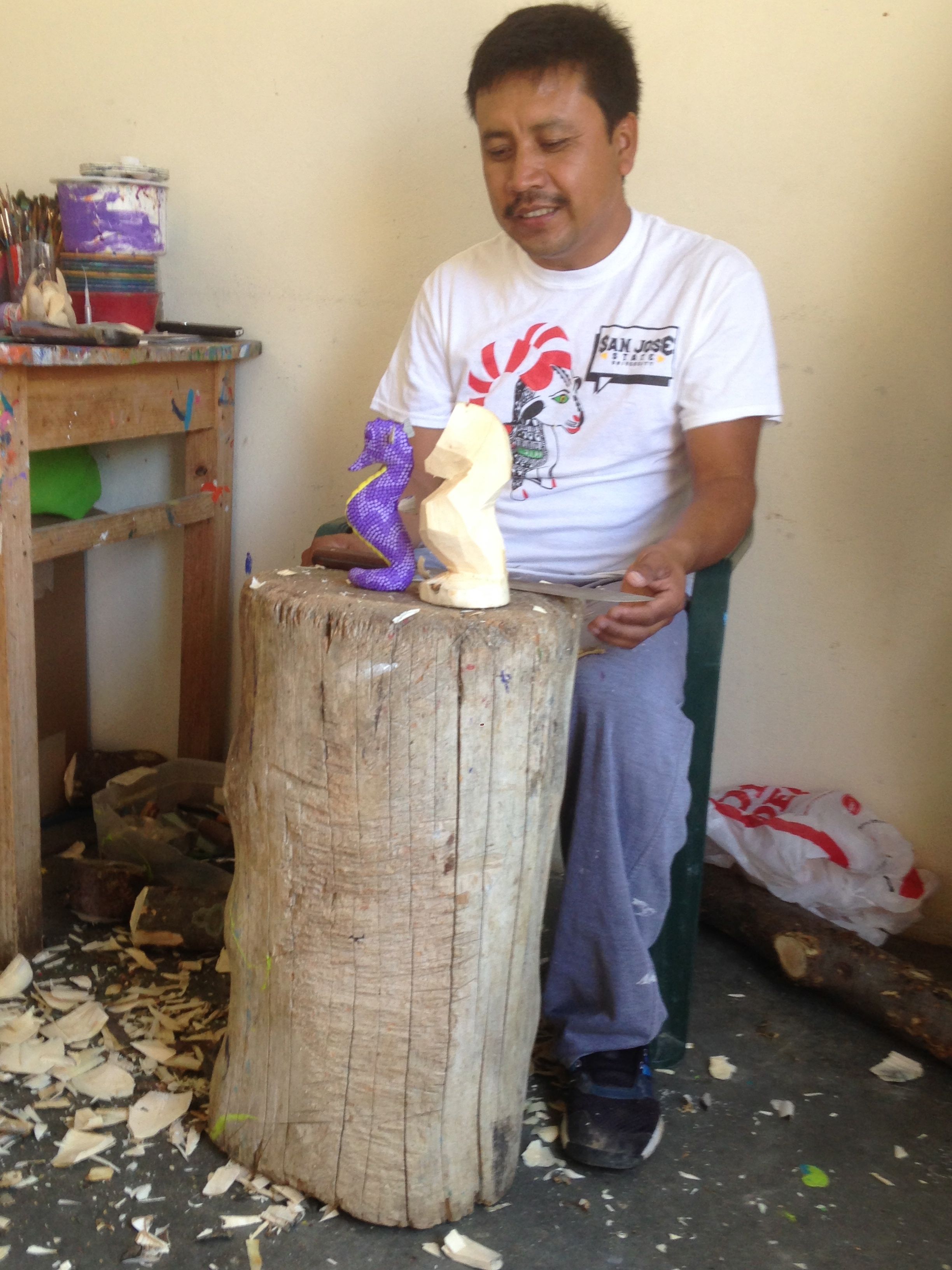 I love the serene pace of the visit with the townspeople. This afternoon, we watched Saul, the alebrijes artisan, carve a seahorse while Alma, his wife, and his middle daughter painted other sculptures.