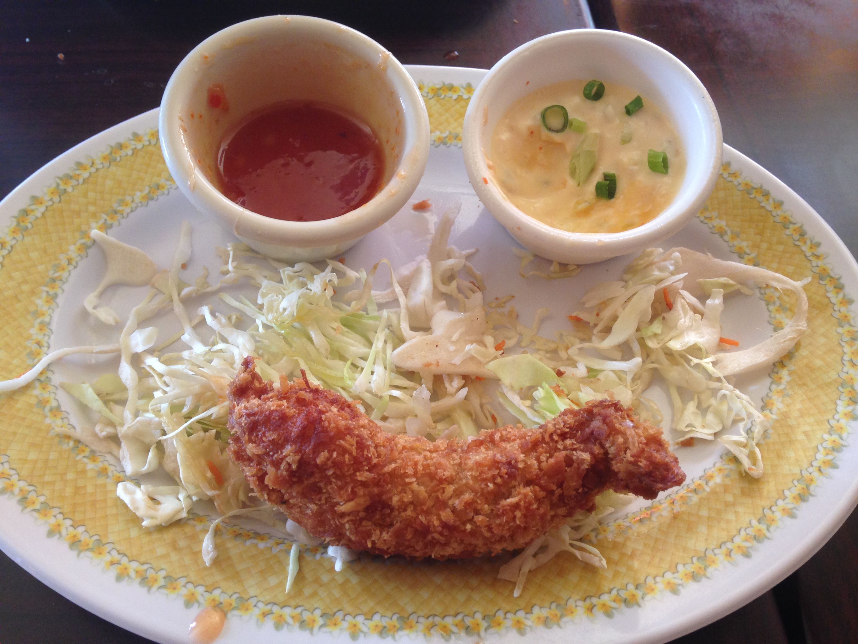 You smile into the plate of delicious coconut shrimp from Charley’s Thai Cuisine at the Queens Shops, off of Waikoloa Drive, and you see your smile reflected in the plate’s arrangement–and you smile bigger.  Your smile is so big it exceeds the plate.